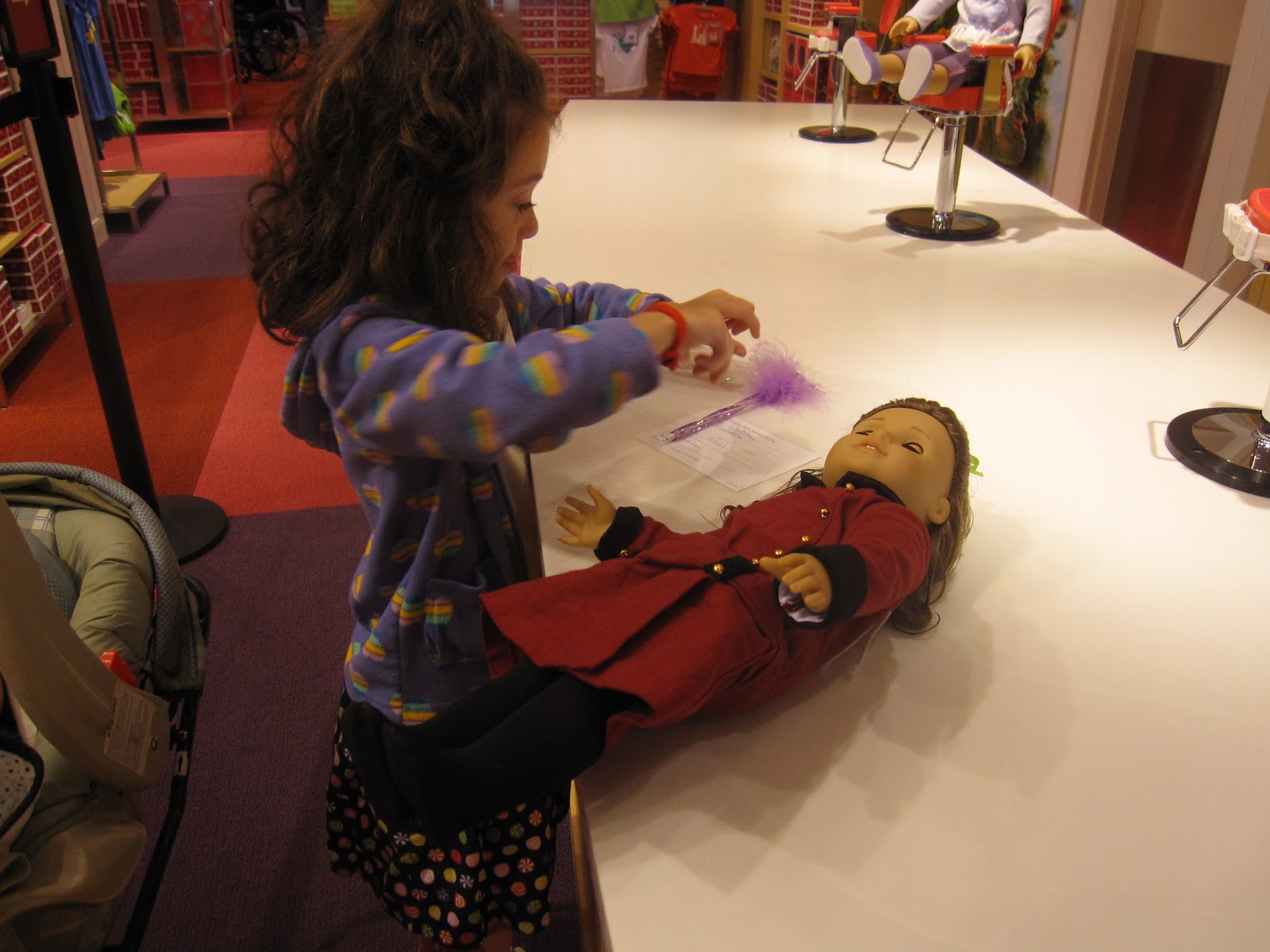 Yes, Gabbie was very excited about the new American Girl Store in Kansas City (actually Overland Park). Yesterday she was off of school for who-knows-what (teacher in-service) so we went to visit the store. Rebecca got her hair done and a new outfit.