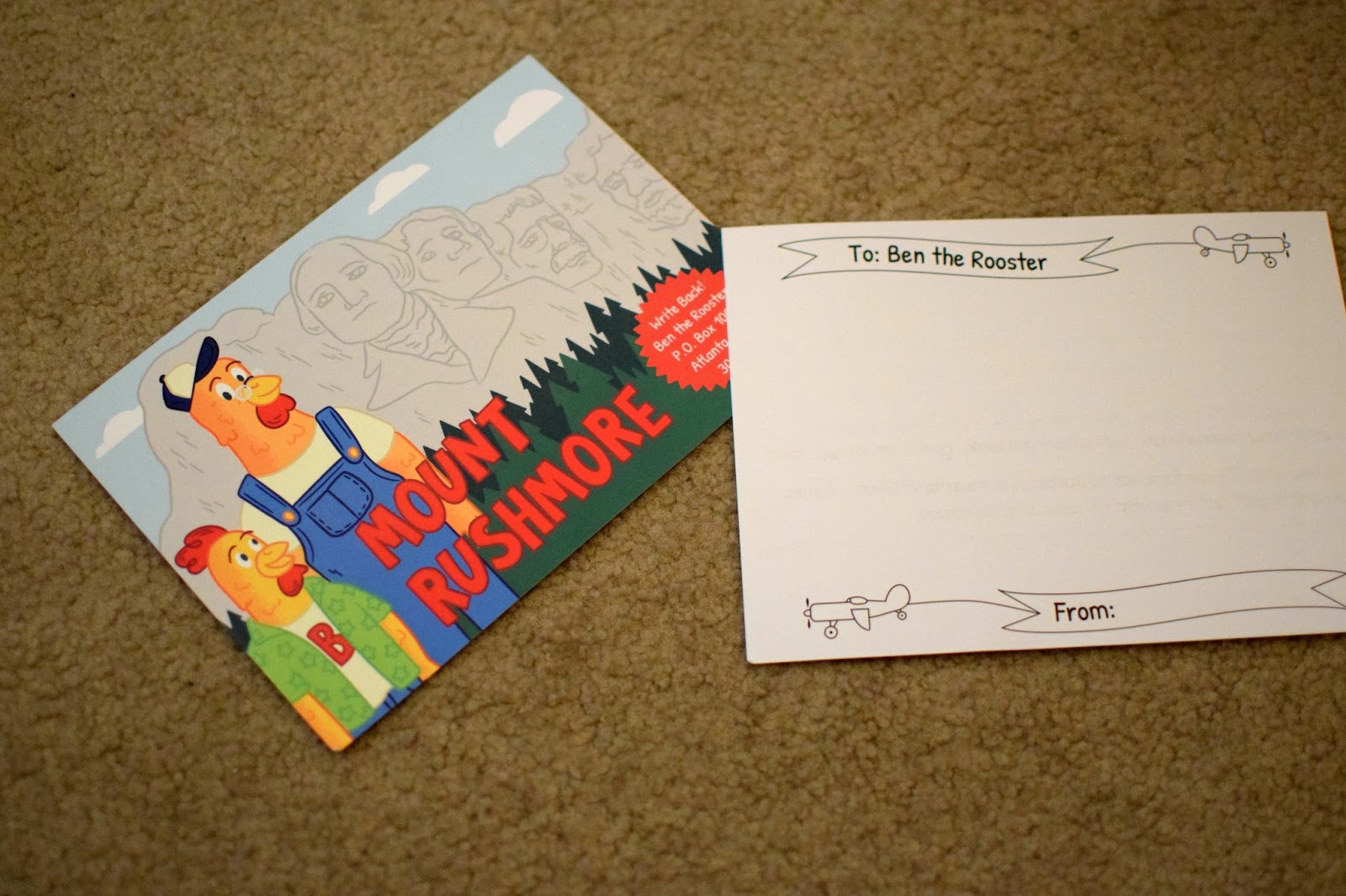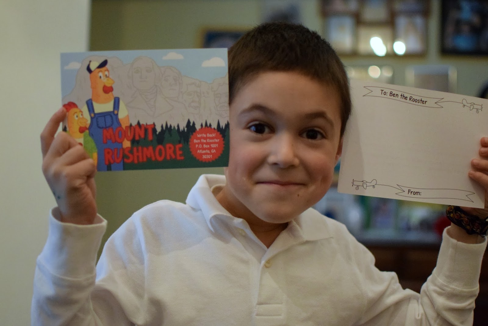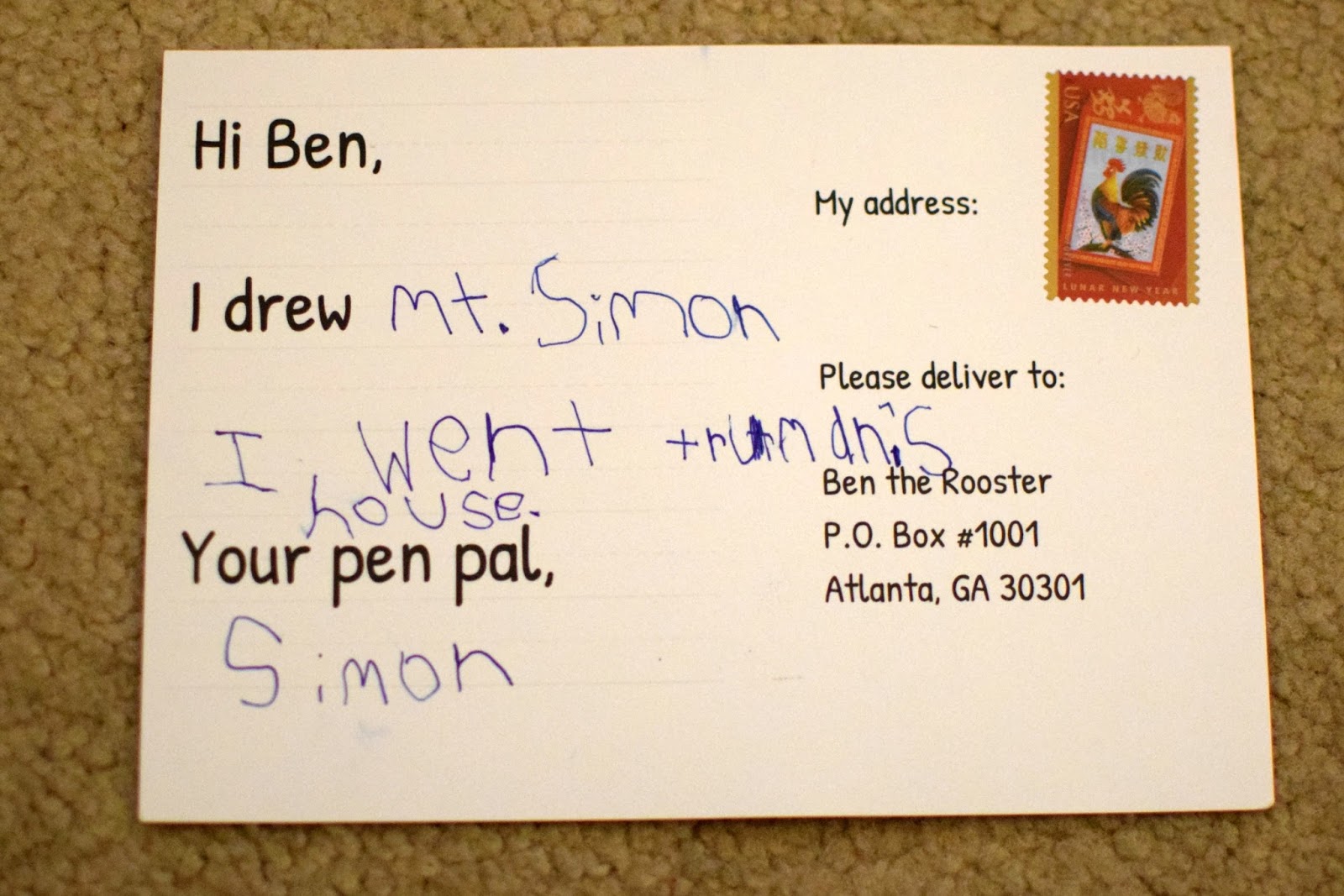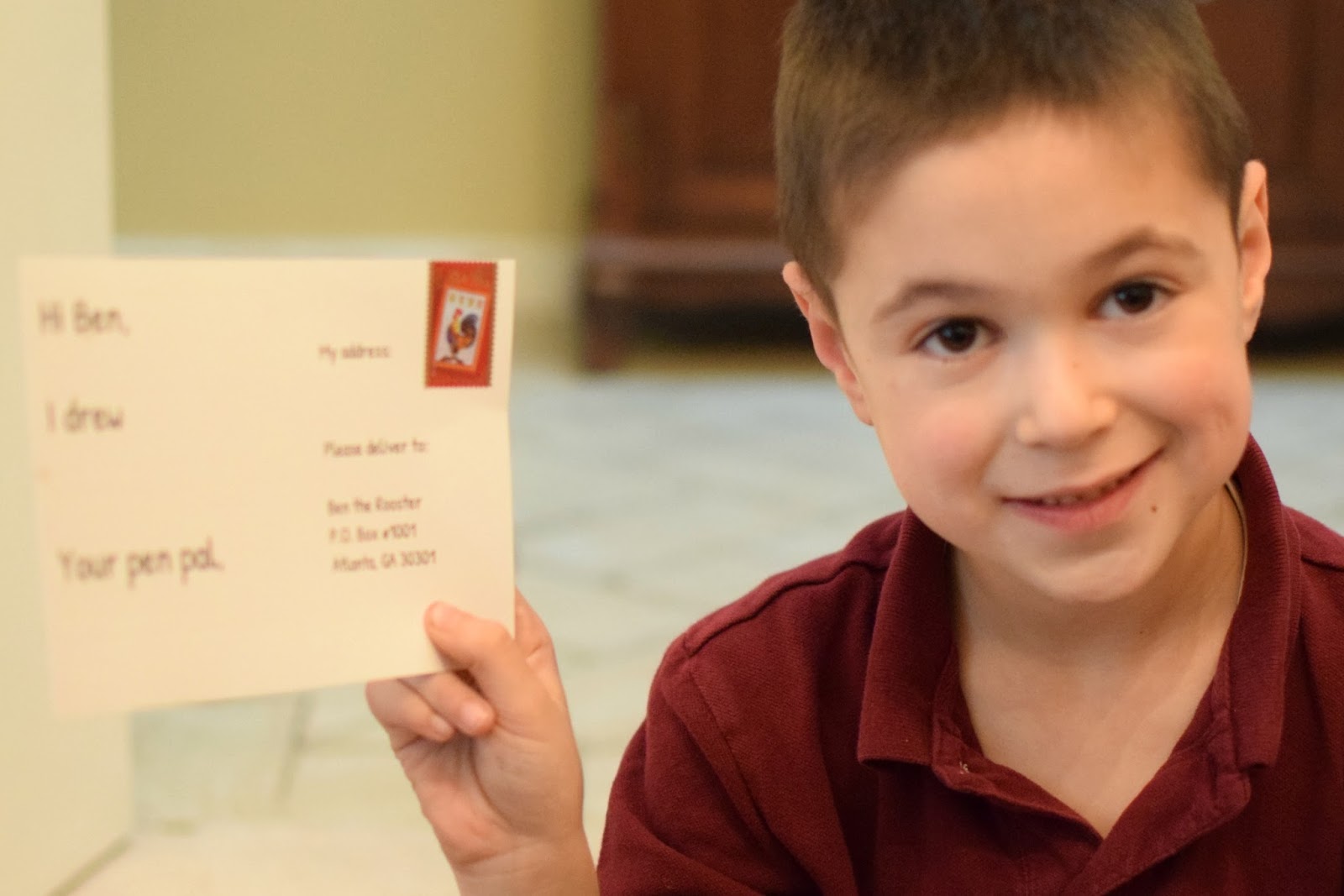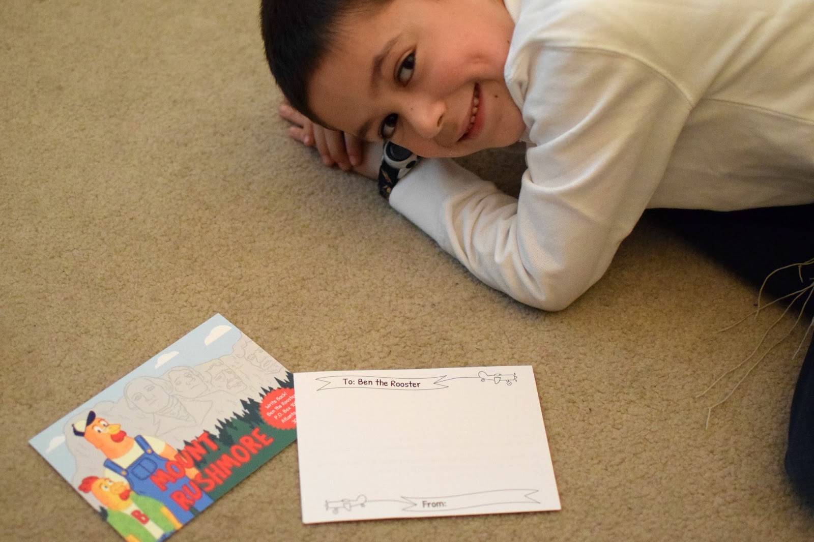 Simon was so excited that he insisted on mailing his reply back to Ben the Rooster immediately! I taught him how to put his postcard in our mailbox so that the mailman would take it. I was happy that the postcard came already stamped, so we could put it back in the mail right away.
