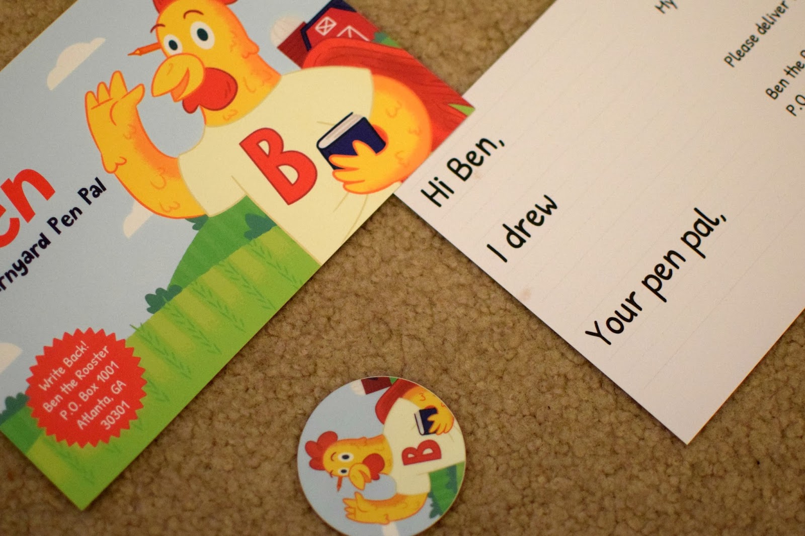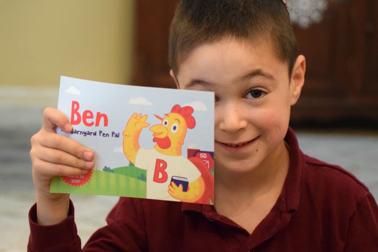 Ben the Rooster is a Barnyard Pen Pal for kids ages 2-8. With the help of his human friend Jason, a children’s writer from Atlanta, he sends kids two postcards each month about life on the farm. Each postcard is an activity, and parents receive an email about discussion ideas before each postcard arrives.