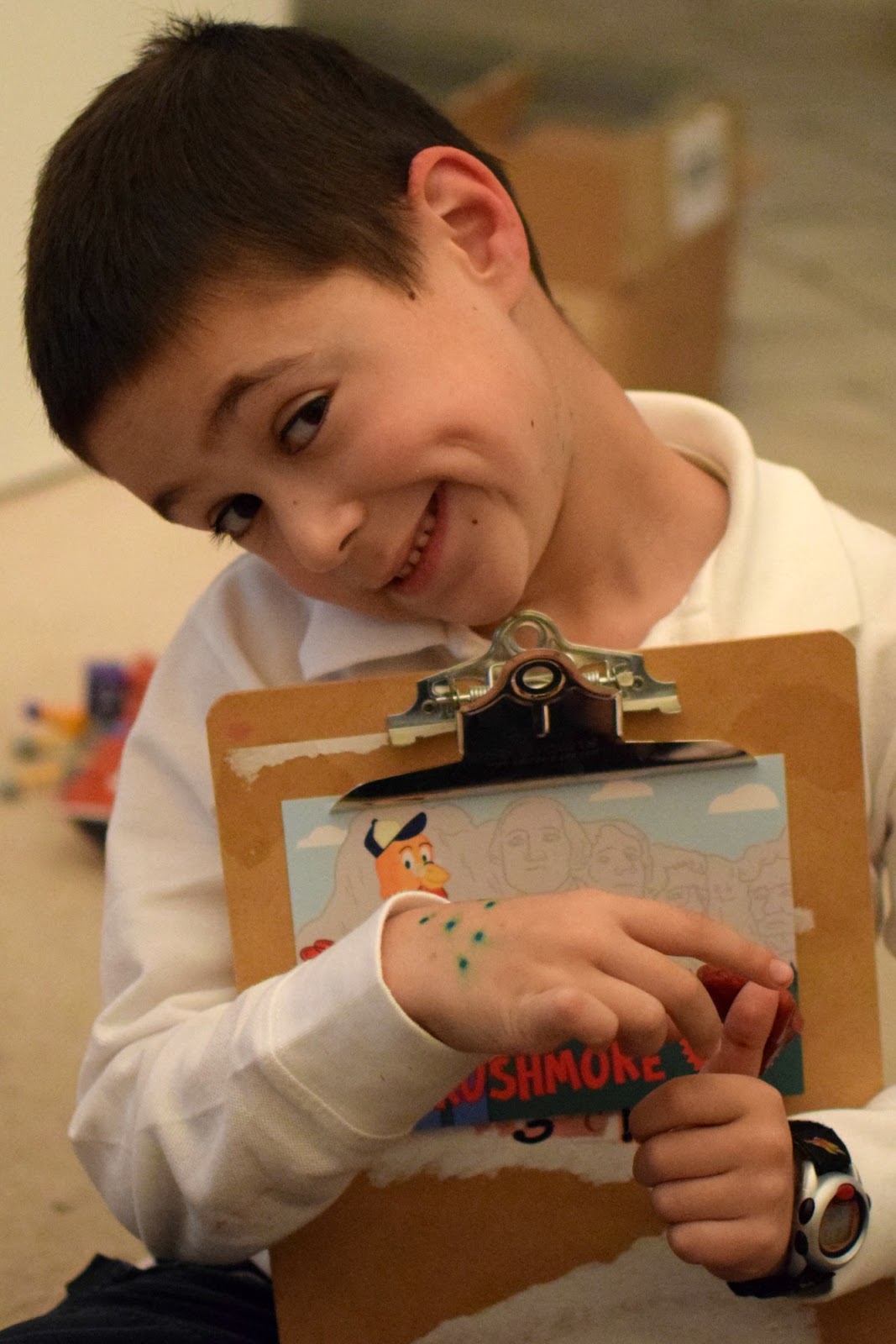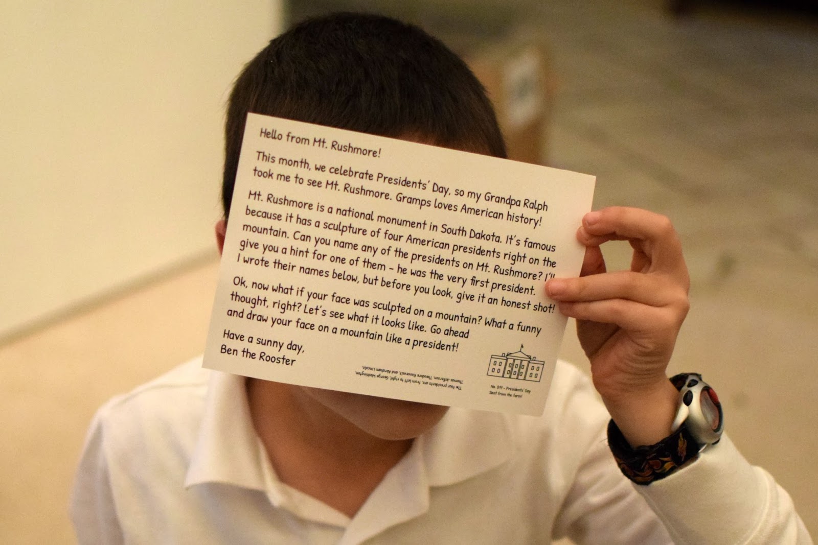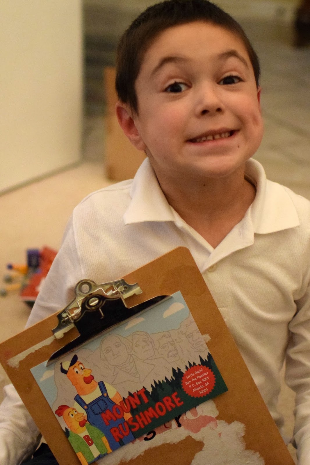 This time, Ben the Rooster wrote about his trip to Mount Rushmore. He asked if we could name the presidents on Mt. Rushmore. Simon was able to identify Washington and Jefferson, who he says he learned about at school. Then he guessed that maybe one of the other presidents was Truman. (They are not – they are Teddy Roosevelt and Lincoln!)