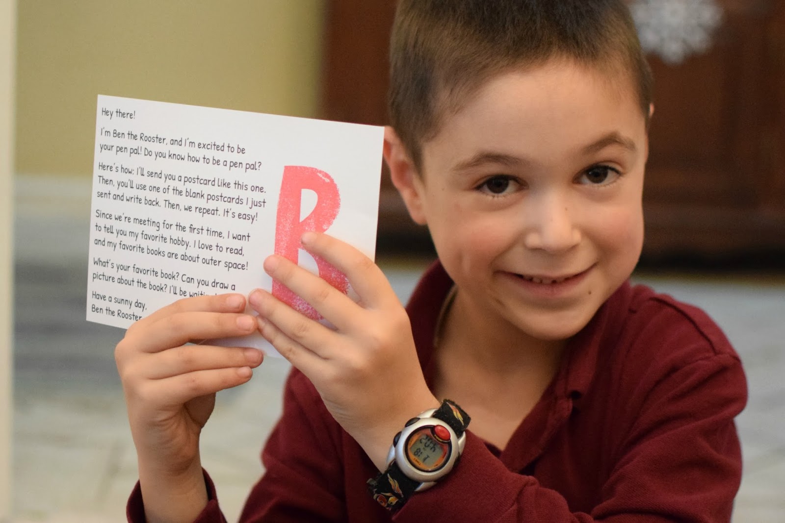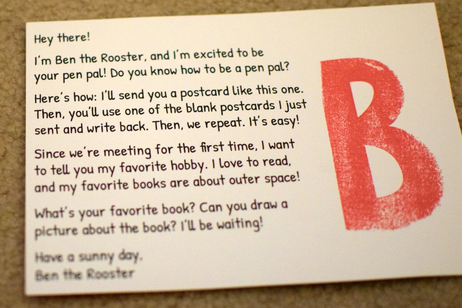 In the first postcard you receive, Ben writes about what it means to be a pen pal and about his favorite hobby, which is reading. Parents can use this postcard to discuss being a pen pal with their children, as well as how the post office works, who brings the mail, how the mailman finds your house, and more. Because Ben mentions his favorite hobby, parents can also discuss the meaning of a hobby with their child.