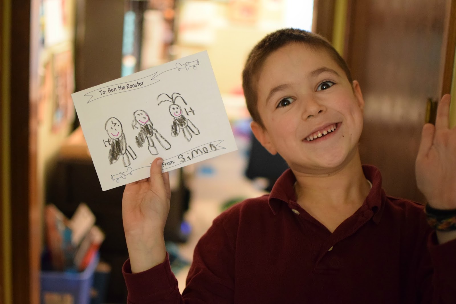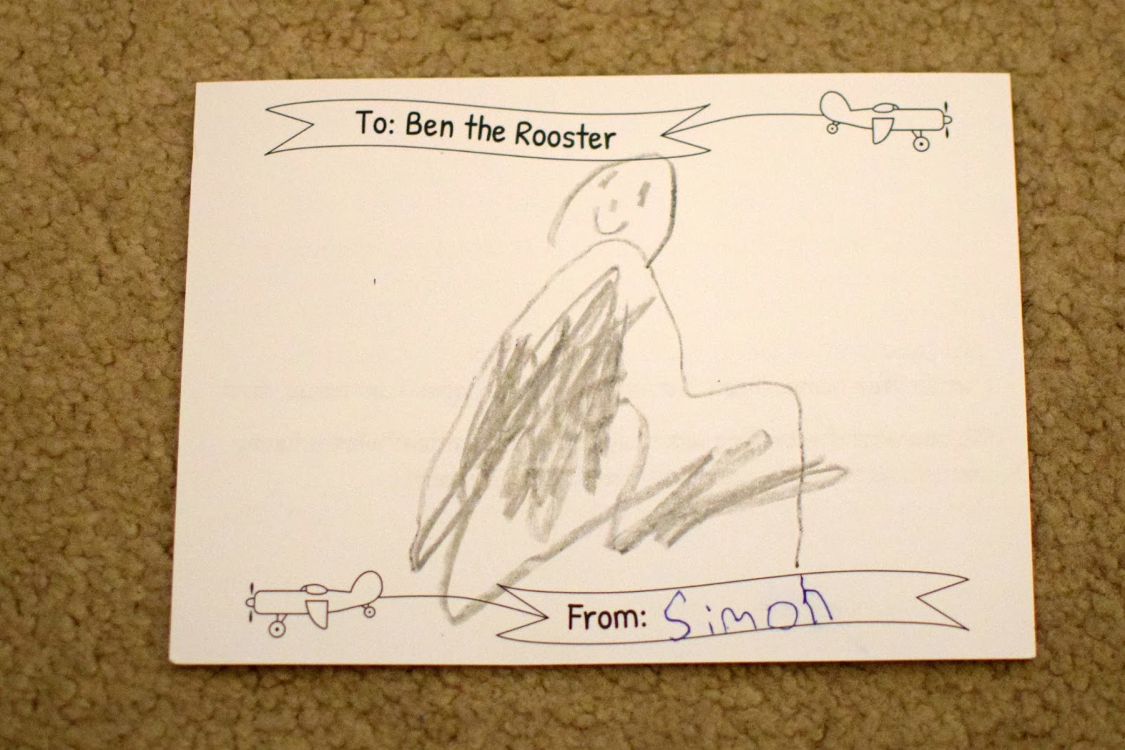 I first heard about Ben the Rooster from Danielle’s blog when she shared her daughter’s experience receiving mail from Ben. My first reaction was that Simon would love that! My second thought was that it would be a great way for Simon and I to practice his reading and writing. Simon is 6 years old and in first grade. His reading seems to be on track for his age, but he is struggling with writing, and especially with spelling. Zachary also has issues with writing and I had been hoping Simon would not have these same issues. Simon is much more willing to practice writing than Zachary ever was and actually enjoys writing in a journal and writing little notes to me, so I had no doubt that he would be excited to reply when he got his first postcard from Ben the Rooster.