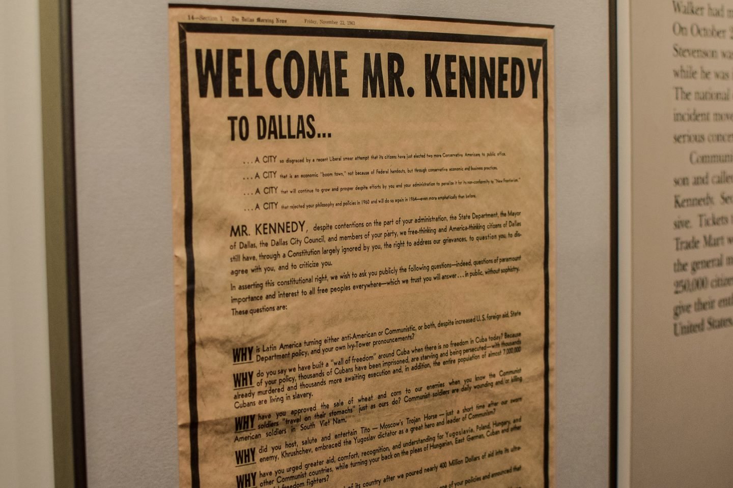 The exhibit begins with an outline of the early 1960s, explaining the social and political climate of the time. It then goes over JFK’s campaign and moves on to his trip to Texas in November of 1963.