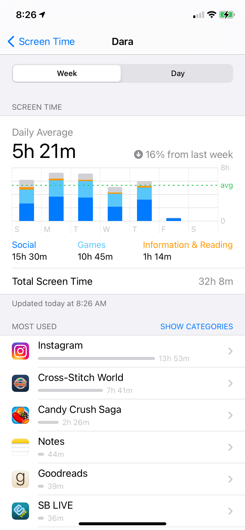 Instagram. Obviously. Cross Stitch World is my favorite game. It’s very relaxing! I play it while I listen to audio books, so I’m not sure why my audio book apps don’t show up here – probably because I use a few different ones depending what book I’m reading. Candy Crush is also a favorite game. I use the Notes app to draft my Instagram posts, which is why it’s up there. Goodreads is obviously an important one. And SB Live is a game show type game that I play for 10 minutes almost every evening, so that’s why it’s shown there as well! It’s part of Swagbucks, a point earning website, and you win points towards that.
