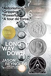 Or, you can call it a gun. That’s what fifteen-year-old Will has shoved in the back waistband of his jeans. See, his brother Shawn was just murdered. And Will knows the rules. No crying. No snitching. Revenge. That’s where Will’s now heading, with that gun shoved in the back waistband of his jeans, the gun that was his brother’s gun. He gets on the elevator, seventh floor, stoked. He knows who he’s after. Or does he? As the elevator stops on the sixth floor, on comes Buck. Buck, Will finds out, is who gave Shawn the gun before Will took the gun. Buck tells Will to check that the gun is even loaded. And that’s when Will sees that one bullet is missing. And the only one who could have fired Shawn’s gun was Shawn. Huh. Will didn’t know that Shawn had ever actually USED his gun. Bigger huh. BUCK IS DEAD. But Buck’s in the elevator? Just as Will’s trying to think this through, the door to the next floor opens. A teenage girl gets on, waves away the smoke from Dead Buck’s cigarette. Will doesn’t know her, but she knew him. Knew. When they were eight. And stray bullets had cut through the playground, and Will had tried to cover her, but she was hit anyway, and so what she wants to know, on that fifth floor elevator stop, is, what if Will, Will with the gun shoved in the back waistband of his jeans, MISSES. And so it goes, the whole long way down, as the elevator stops on each floor, and at each stop someone connected to his brother gets on to give Will a piece to a bigger story than the one he thinks he knows. A story that might never know an END…if Will gets off that elevator.”