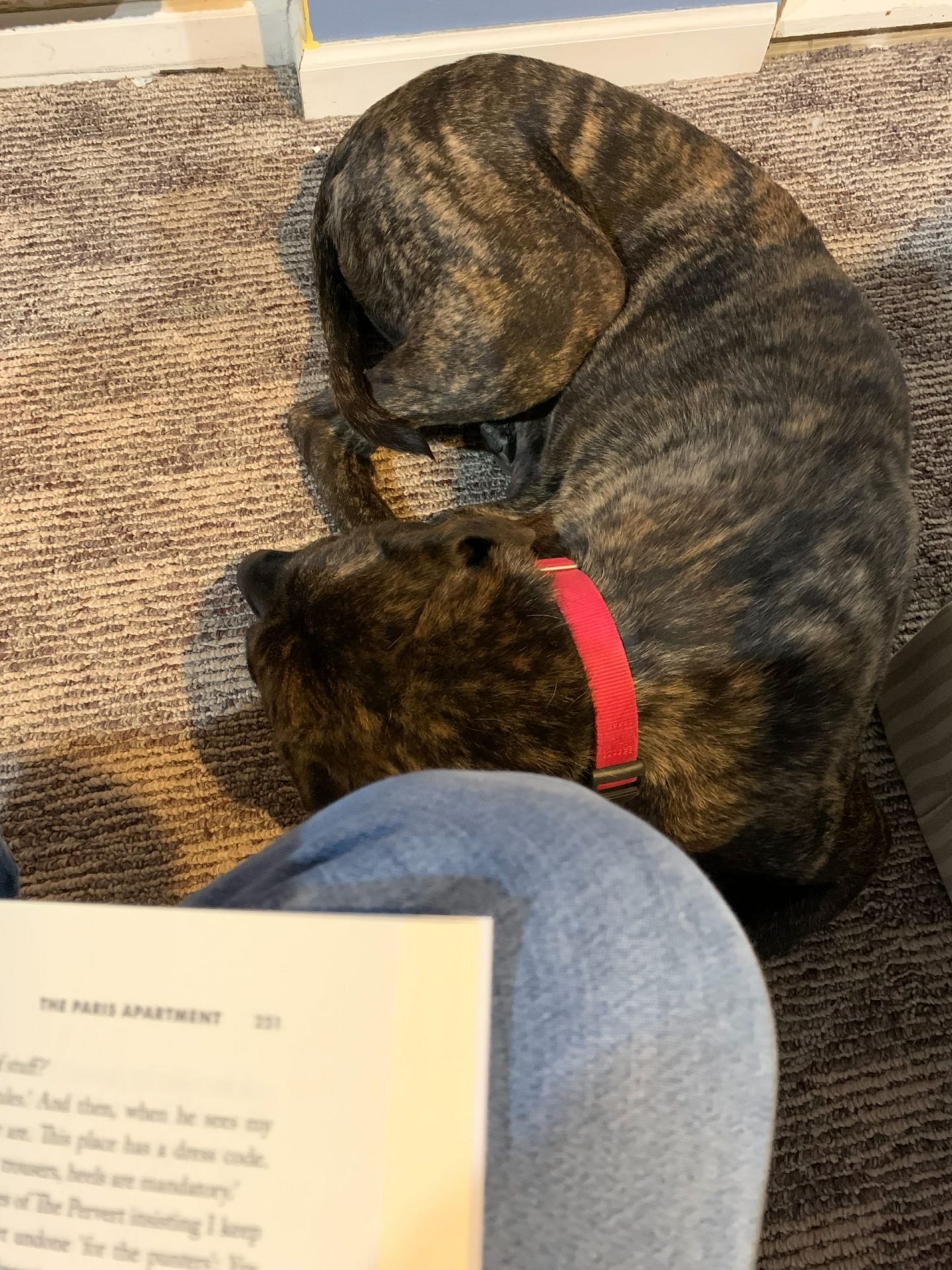 I’m sure you all know that I read a lot and whenever I have down time during the day, I’m reading. I also listen to audio books while I run (jog). While I was preparing this post, I was reading The Paris Apartment by Lucy Foley and having a hard time putting it down! Mika was lying nearby!