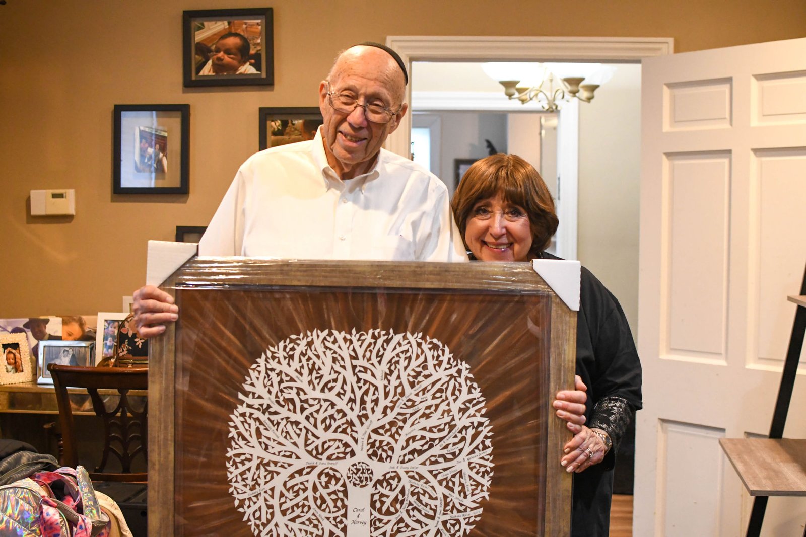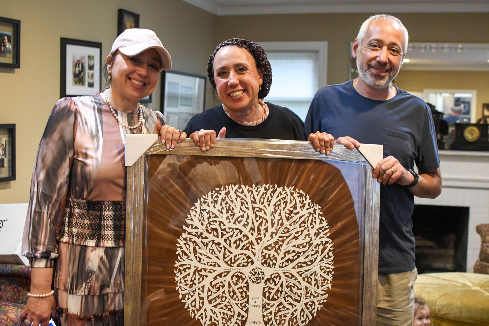 Dave and his sisters presenting a family tree paper cut to their parents: