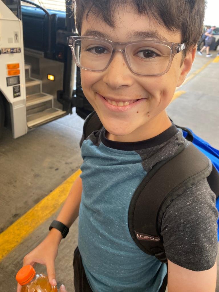 Simon is back! Dave was the designated flight chaperone so he flew out to Chicago and met the camp bus, got himself and 6 kids checked in, and flew home with them. Simon of course arrived with a cold, but in general good spirits.