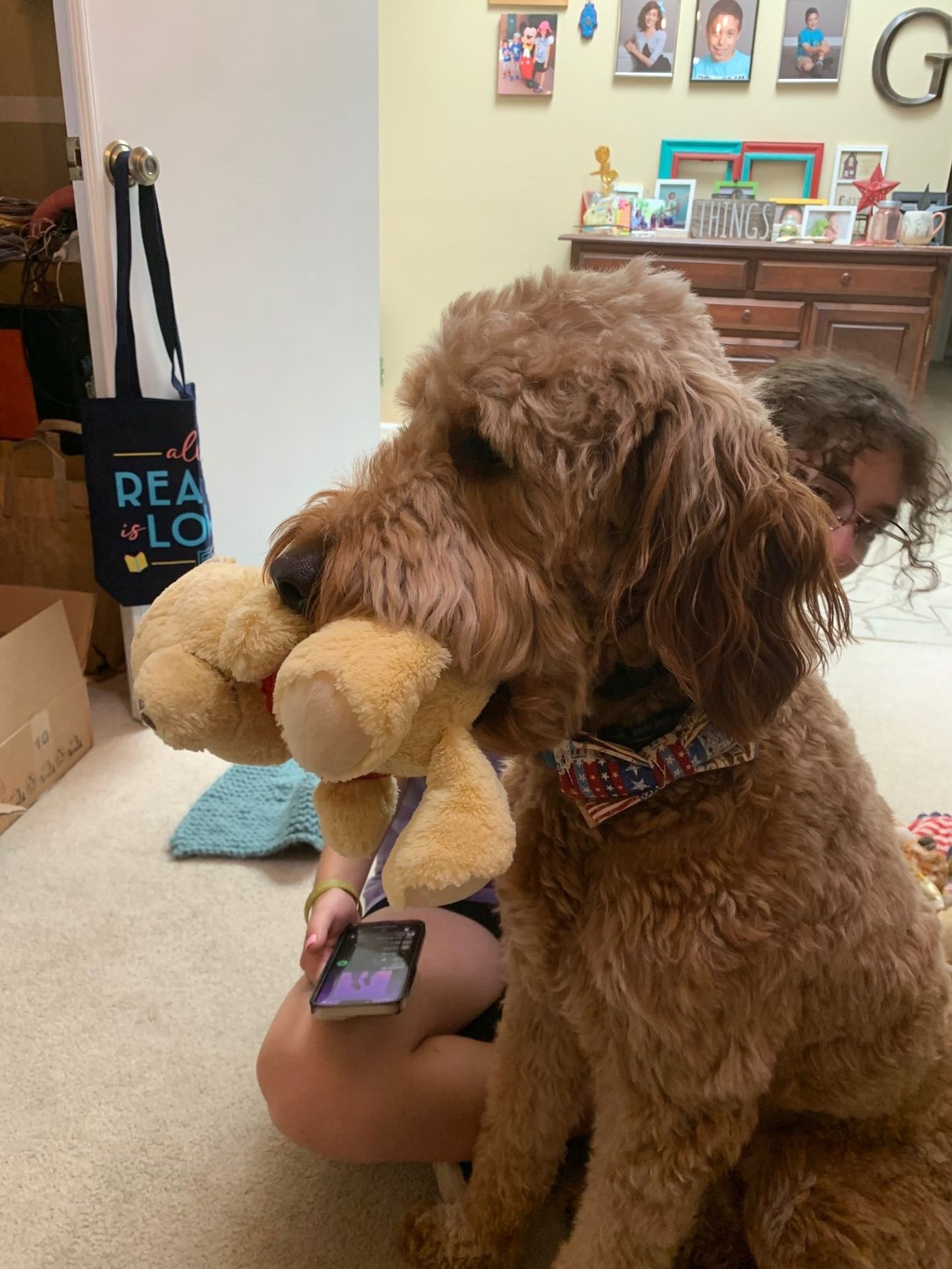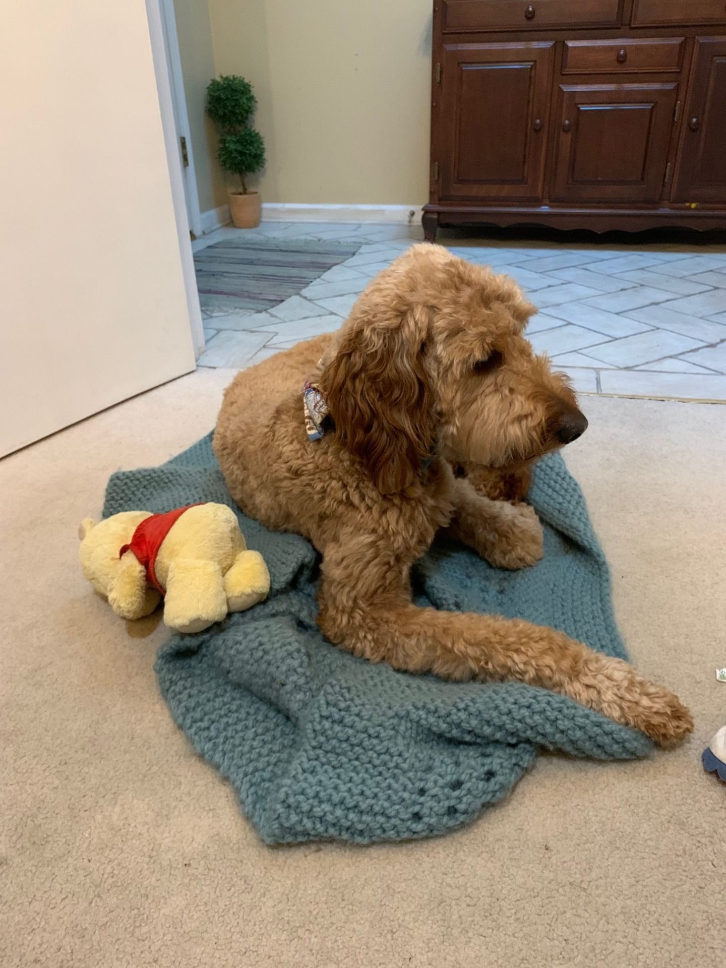 On the day that Winnie came to stay, our lawn guy mowed the backyard and uncovered a nest of some sort of stinging insect. The jury was out as to whether it was wasps or hornets, but Winnie definitely couldn’t head out to the yard to pee! At the same time, we had our driveway and garage floor torn out due to the concrete sinking and needing to be replaced. So bringing him out in the front yard could have been hard as well. But he rolled with it. And when our exterminator came he said it was just a wasps nest and it was easily taken care of, so the backyard is open again.