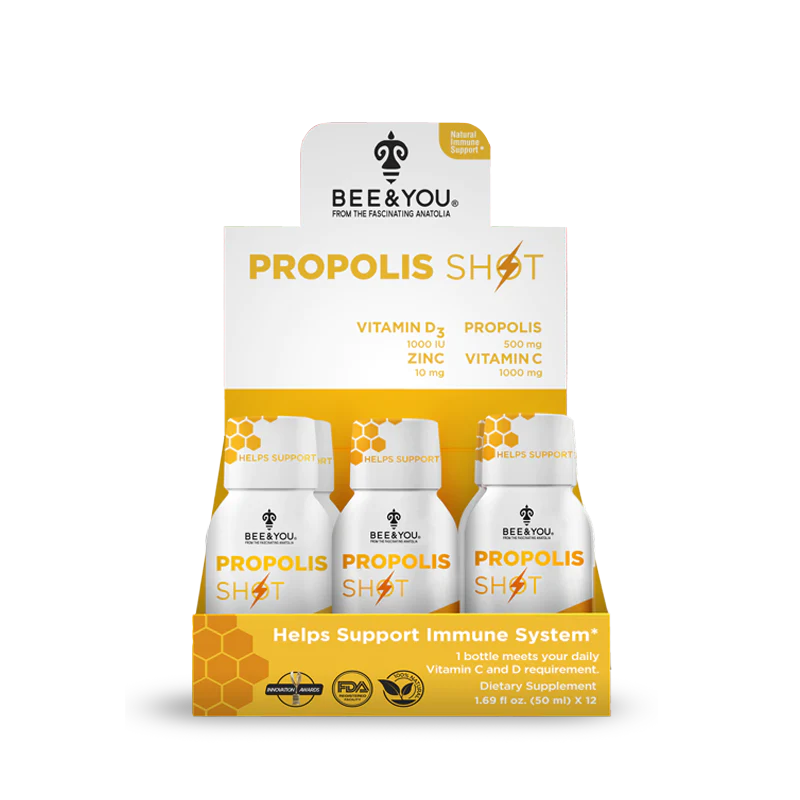 Bee & You – Vitamin C + Zink Propolis Shots – Great Tasting for great immune support! Zinc and Vitamins C and D are integral parts of the immune system and show synergistic functions at various stages of the host defenses, such as the maintenance of the integrity of biological barriers and the functionality of cells that make up the innate and adaptive systems. This product has all 3 along with miracle Anatolian propolis Extract!