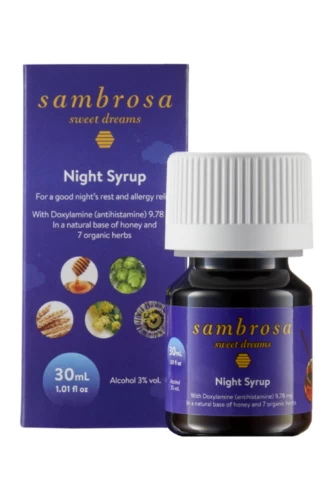 Sambrosa – Night Syrup – Sambrosa Sweet Dreams promotes a good night’s rest with the naturally-based ingredients of honey and 7 organic herbs with a small dose of doxylamine, which has been shown to help achieve better quality rest.