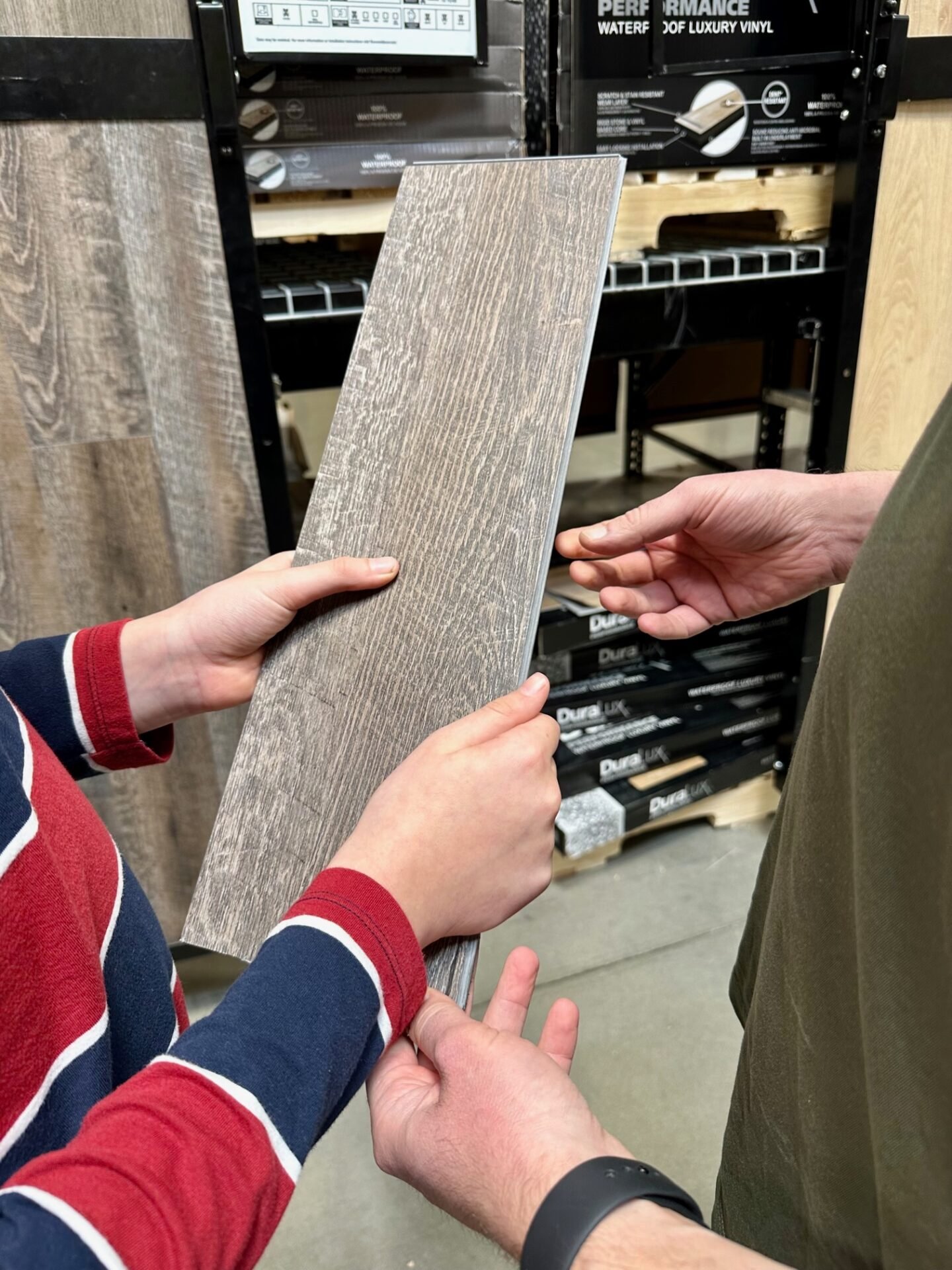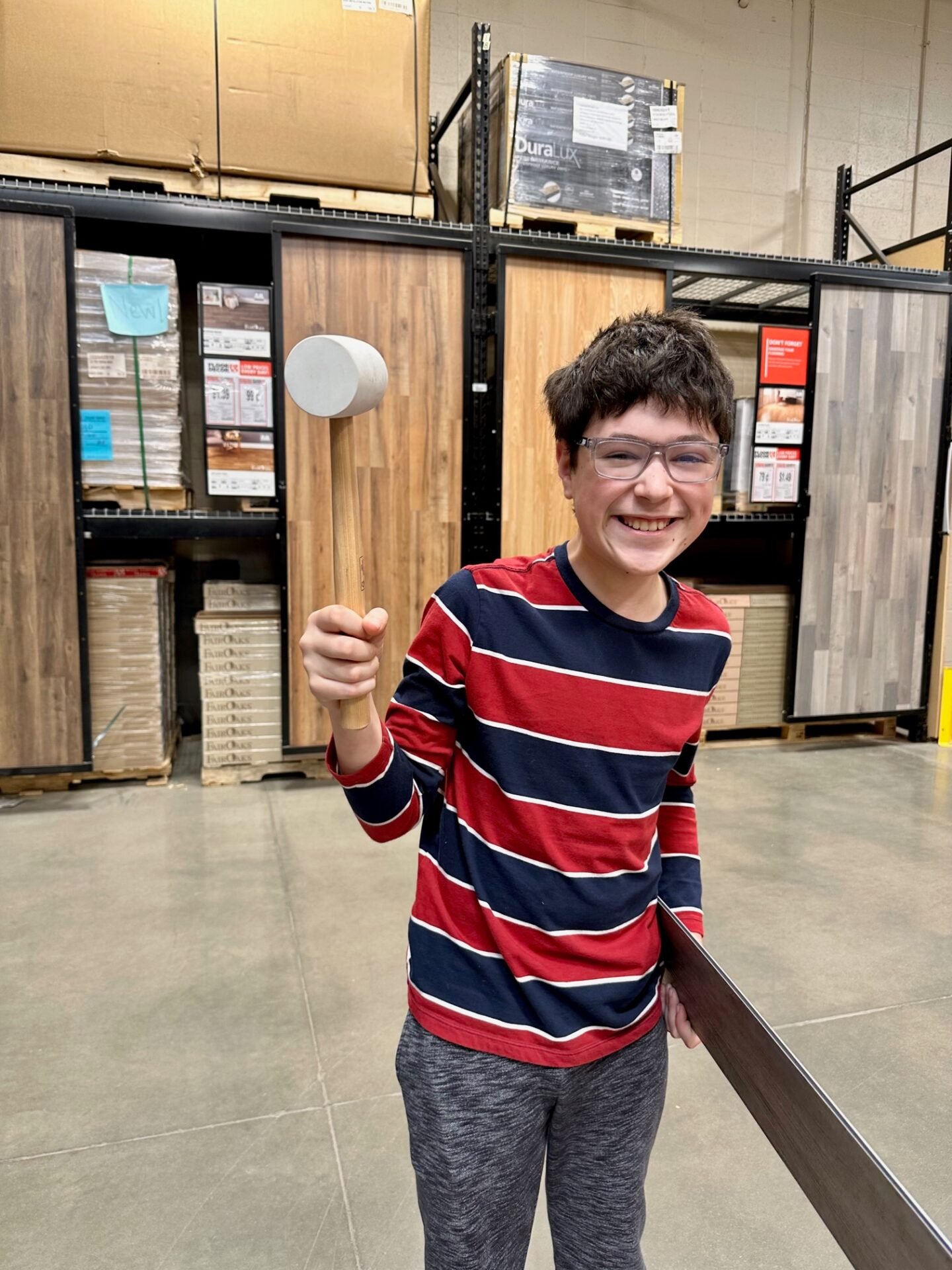 Dave, Simon, and I went to the floor store to look at flooring options for our living room model. We had a fun time, especially Simon, who thought this mallet was quite funny.
