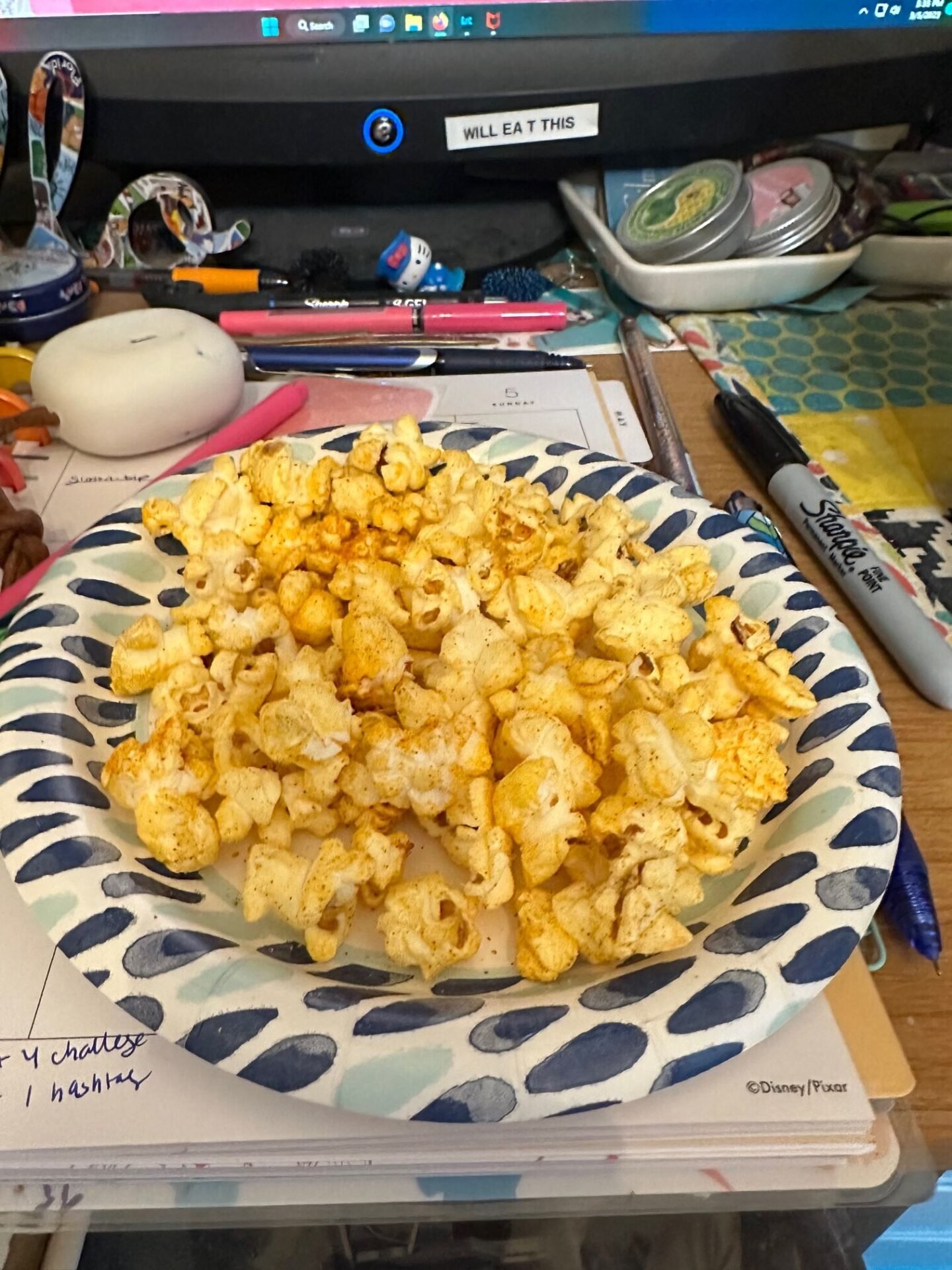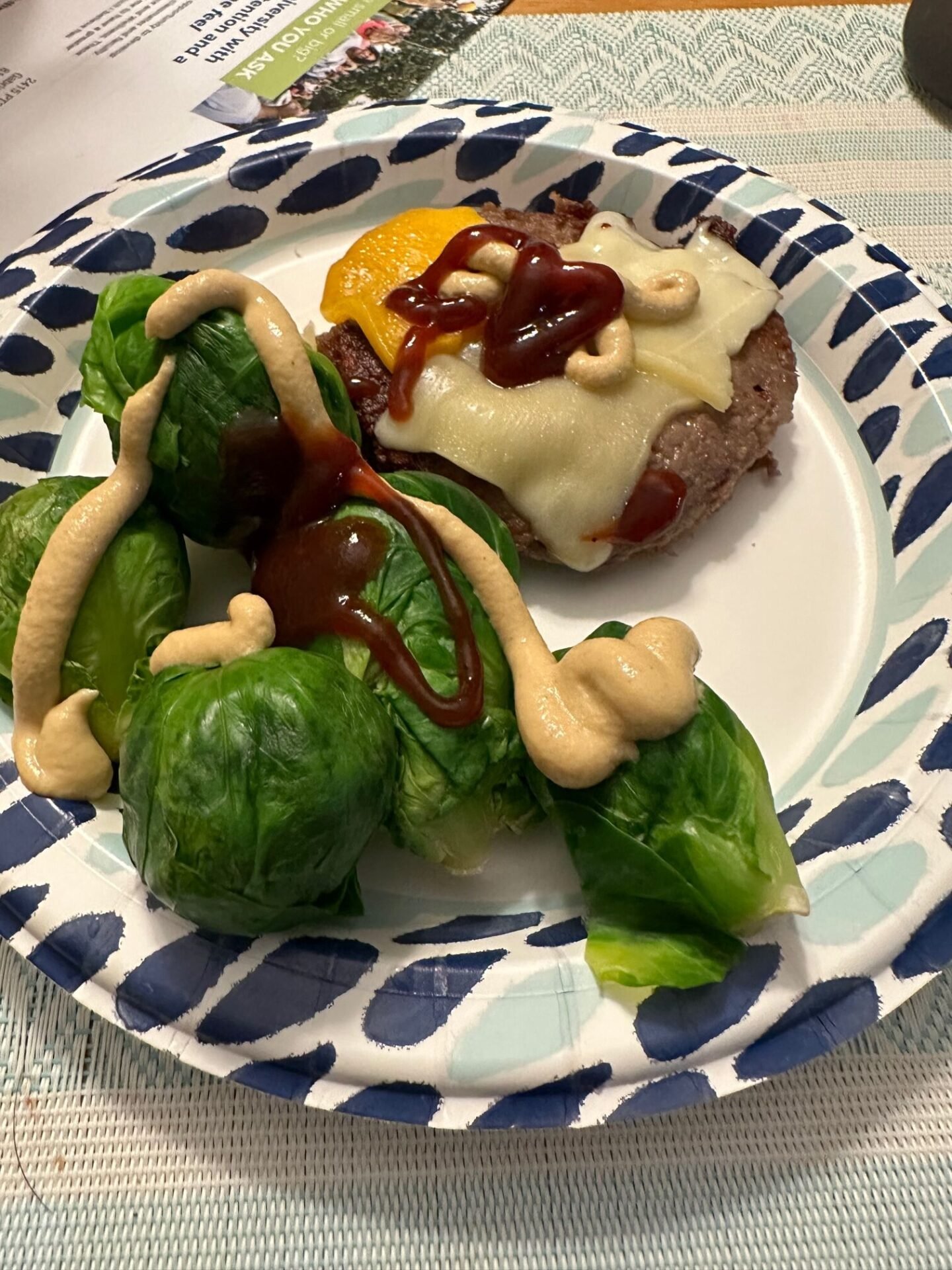 Then we had dinner – a Beyond burger with cheese and Brussel sprouts and yes I put too much mustard on my Brussel sprouts.