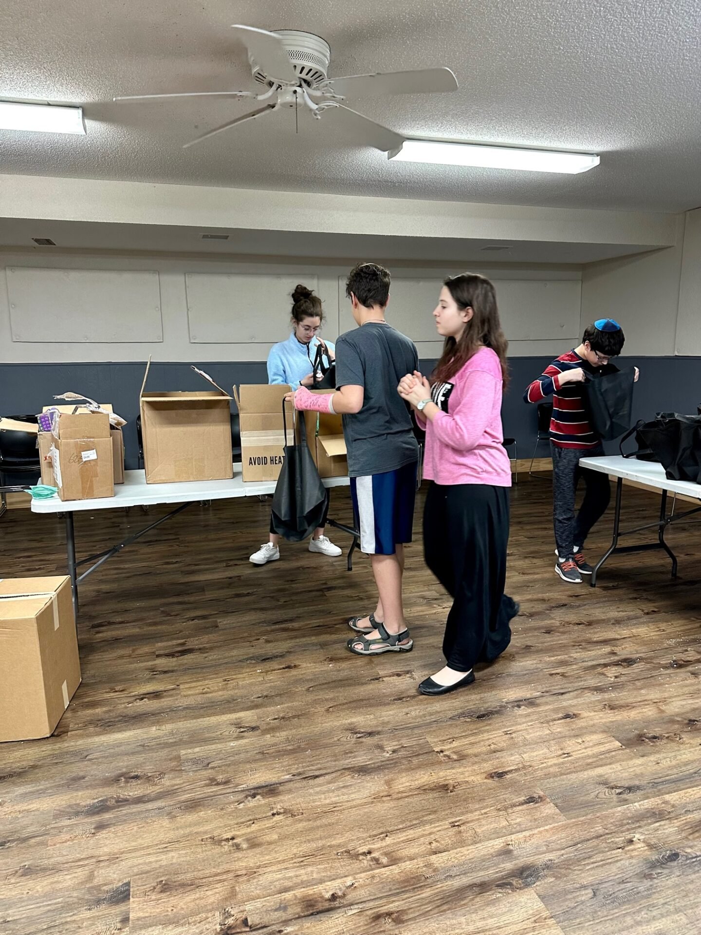 Finally, we went to the synagogue to put together the Purim gift bags that the synagogue gives out – this has been a program I’ve organized for many years now. Two of Simon’s friends came with us to help and it went quickly!