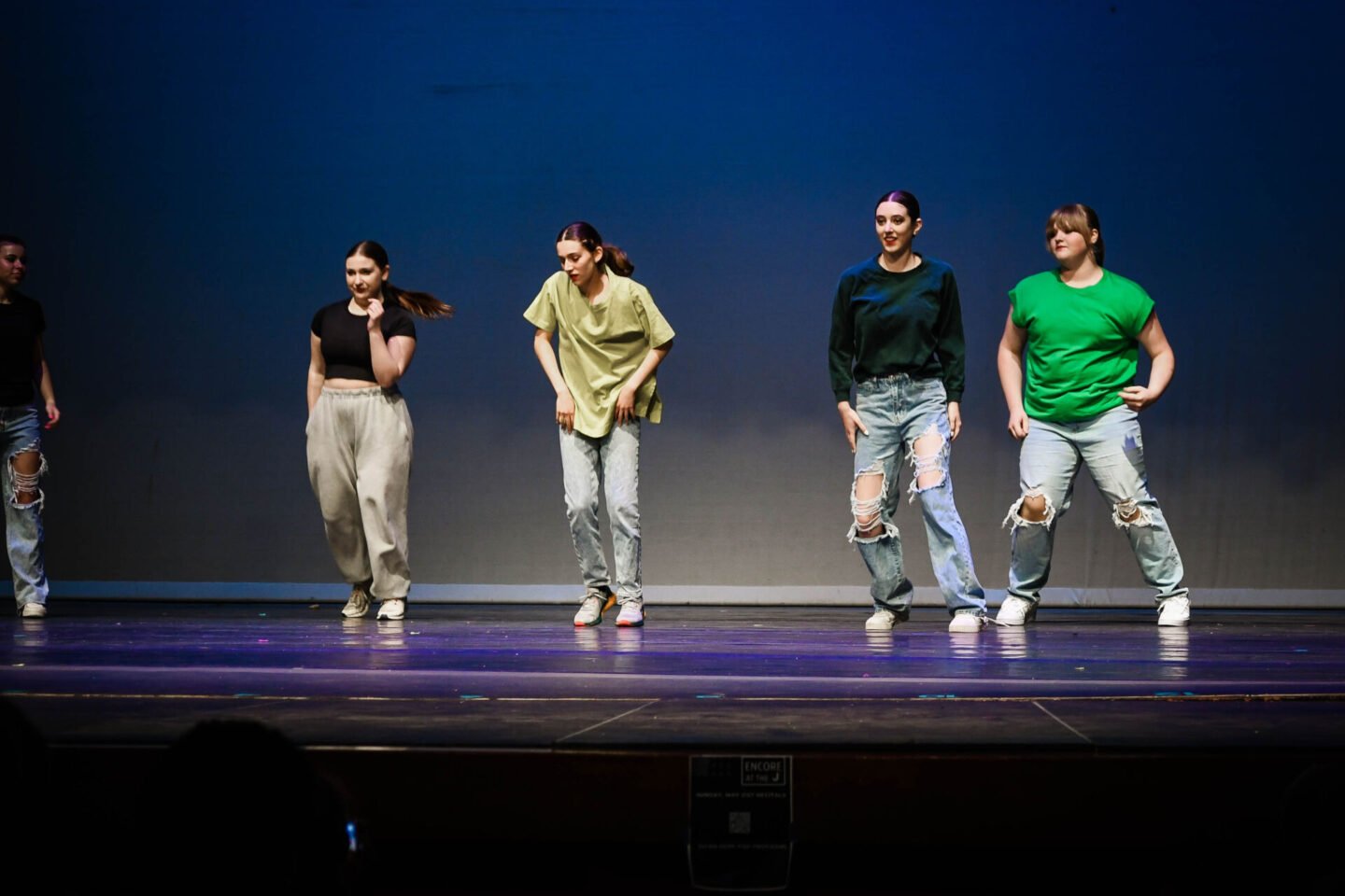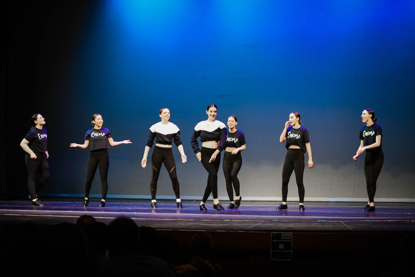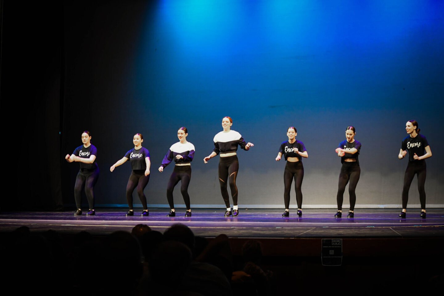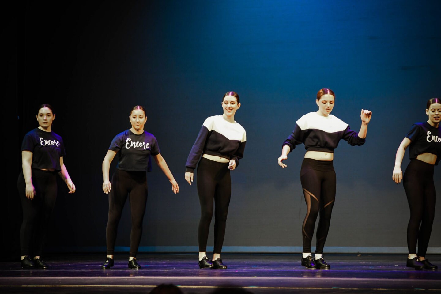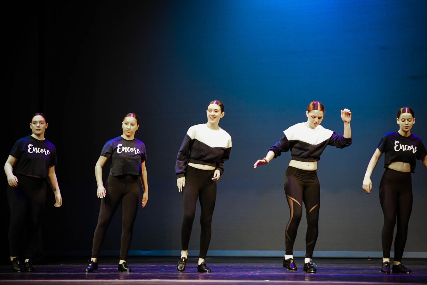 The first dance was tap and there was no music, just the rhythm of the tap shoes and some voices. They did a cute thing where they pretended Gabbie made a mistake and they all said “wrong dance, Gabbie!” and the audience laughed. Gabbie and the other senior are in the middle here, with the different costumes.