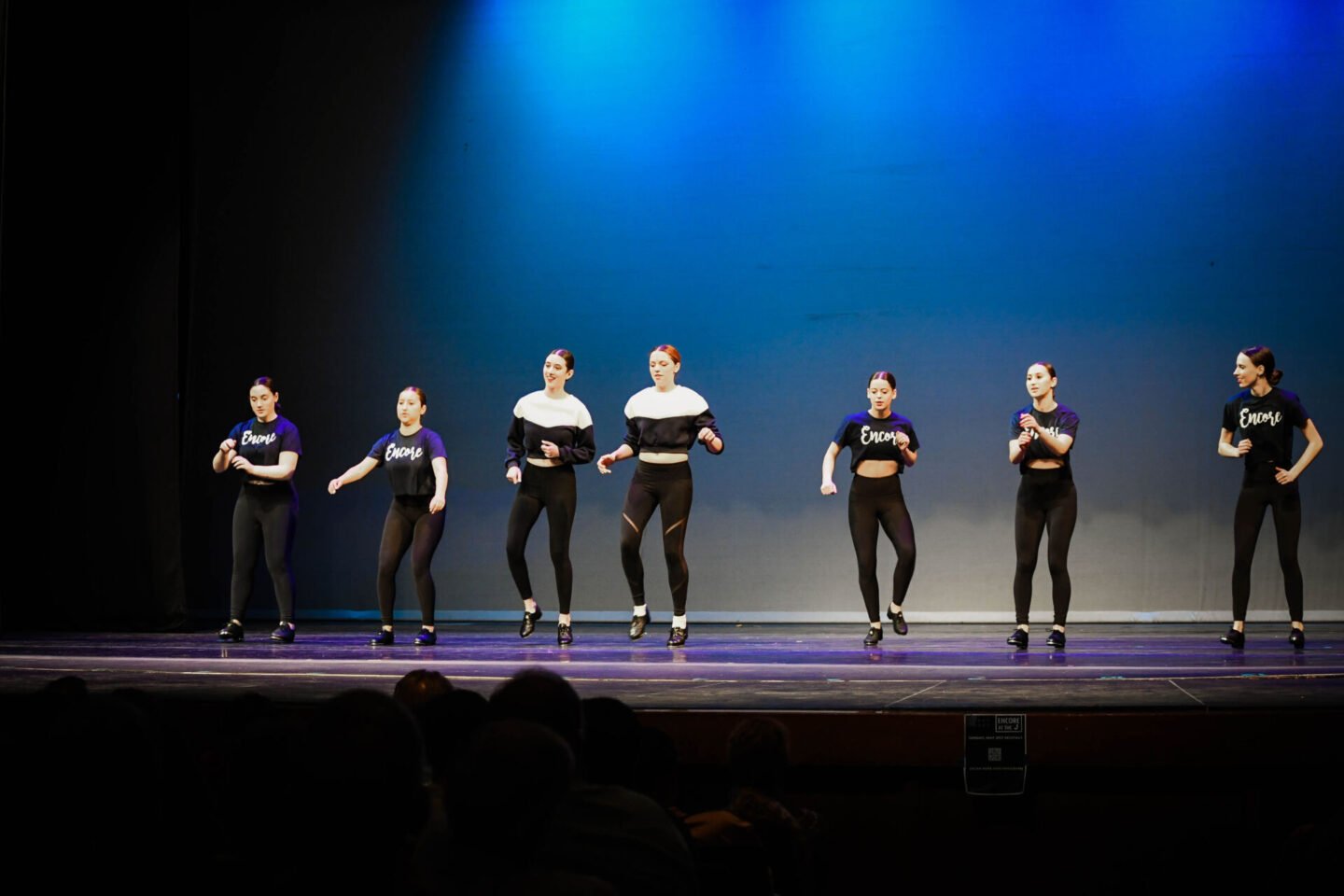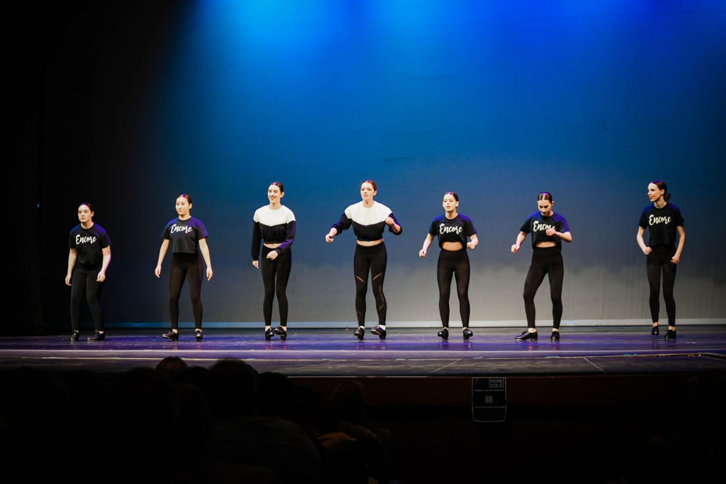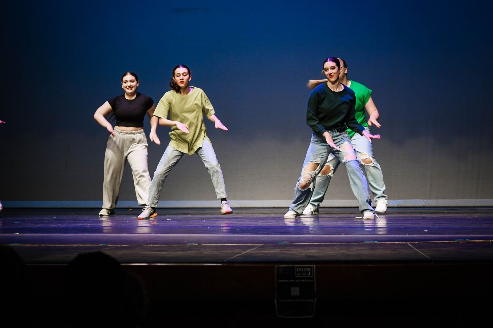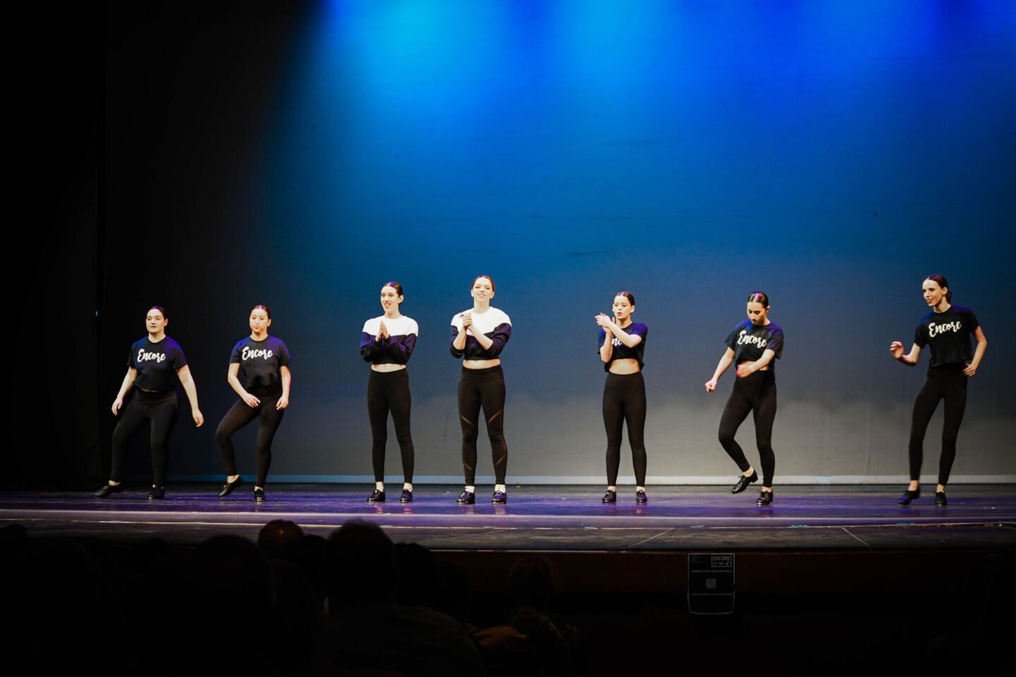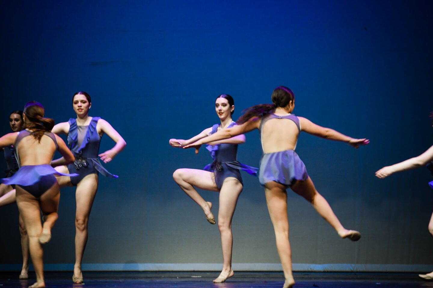 The first dance was tap and there was no music, just the rhythm of the tap shoes and some voices. They did a cute thing where they pretended Gabbie made a mistake and they all said “wrong dance, Gabbie!” and the audience laughed. Gabbie and the other senior are in the middle here, with the different costumes.