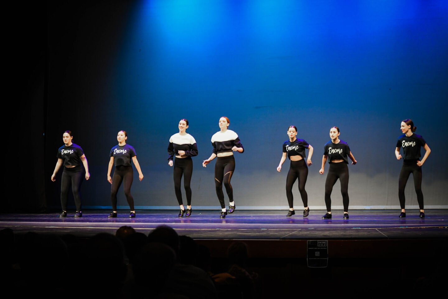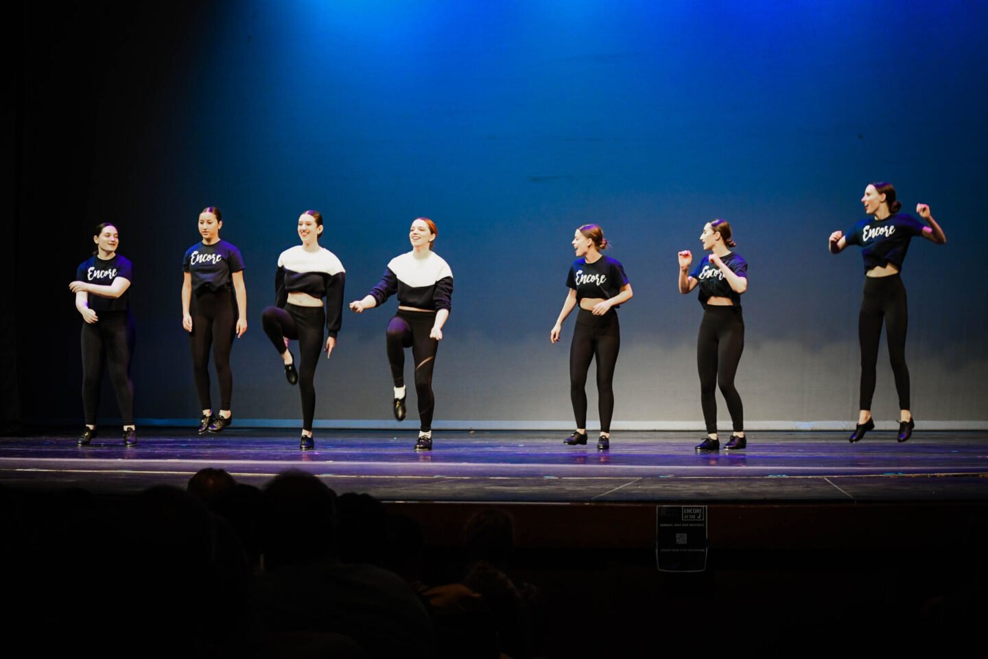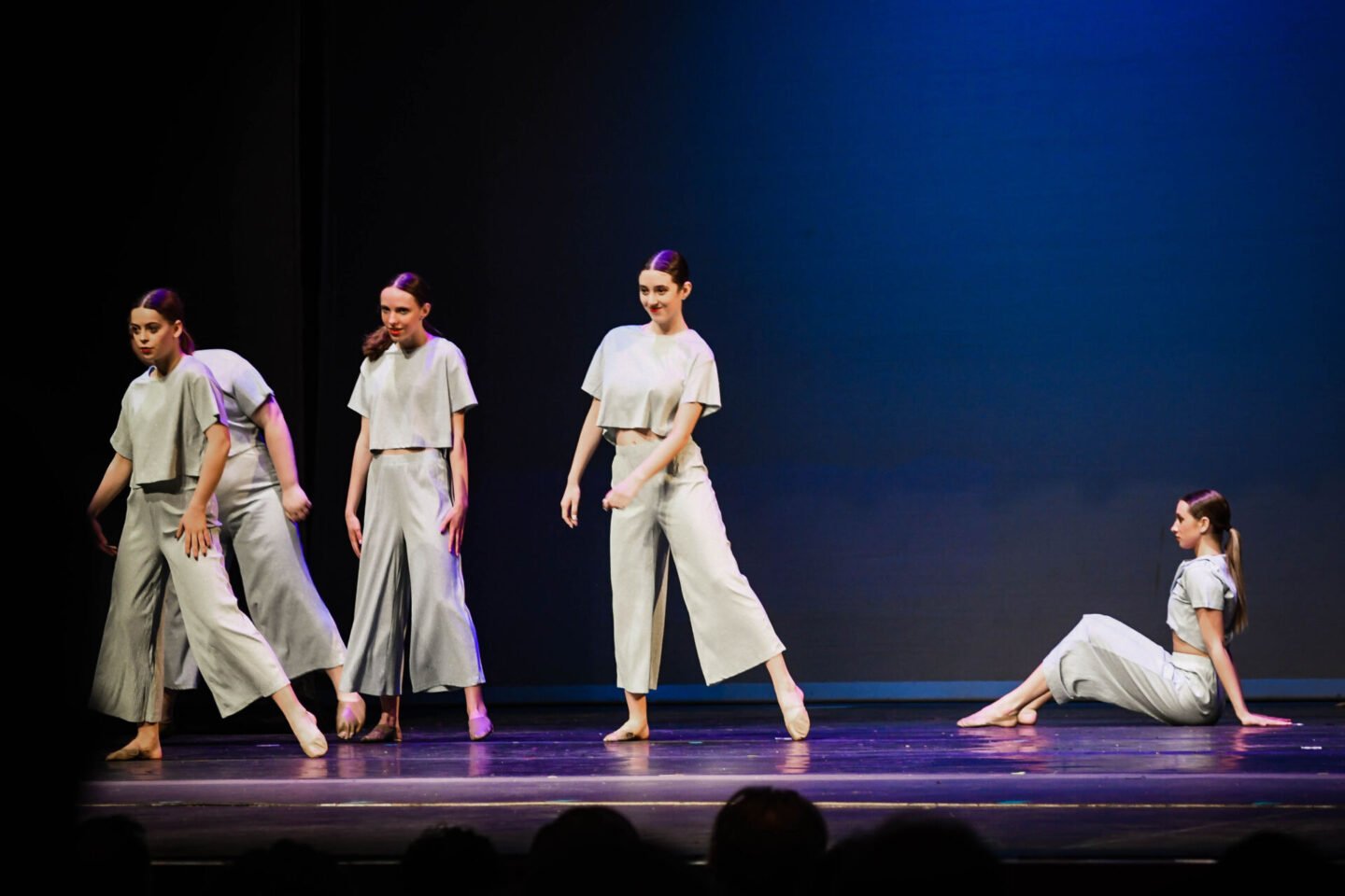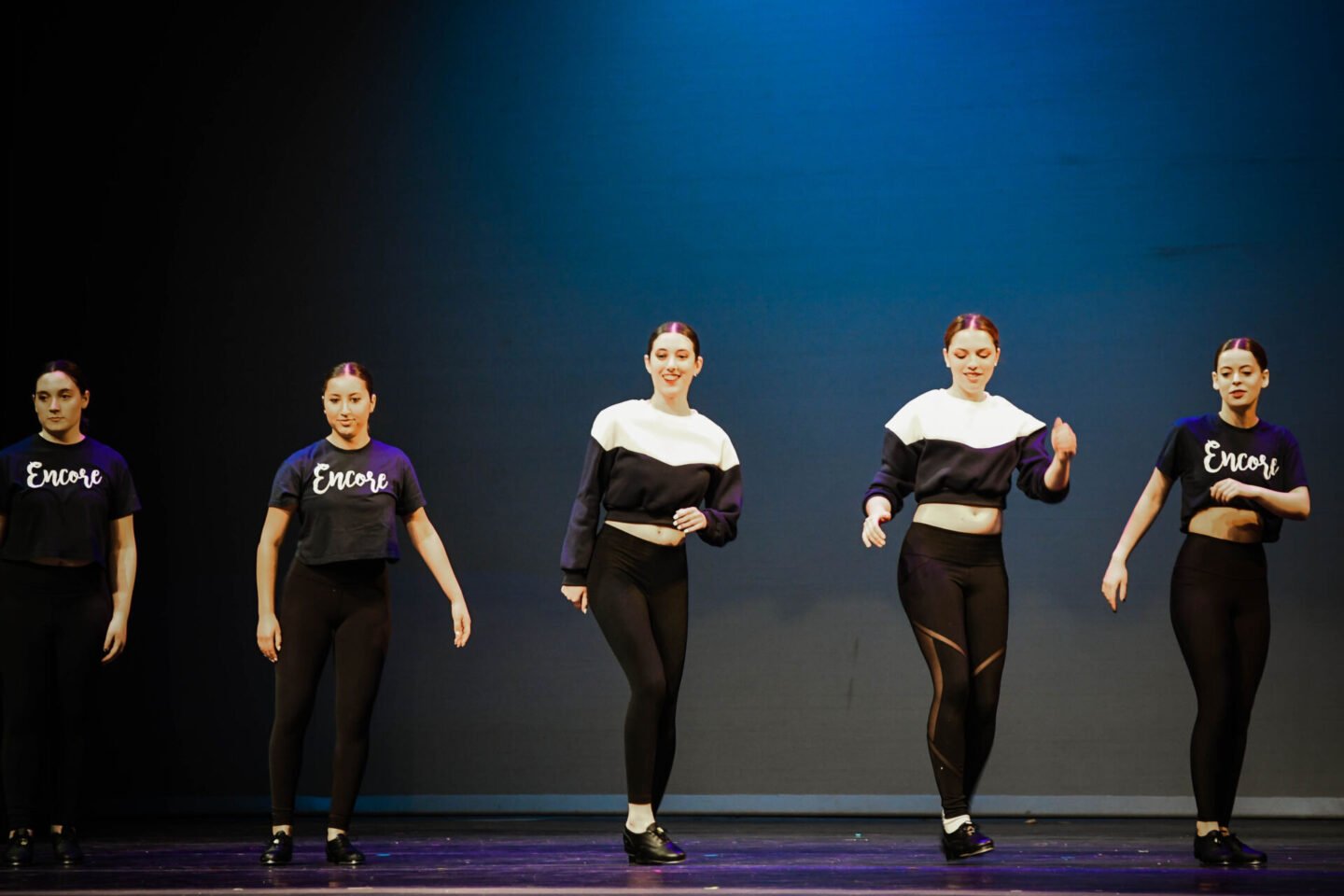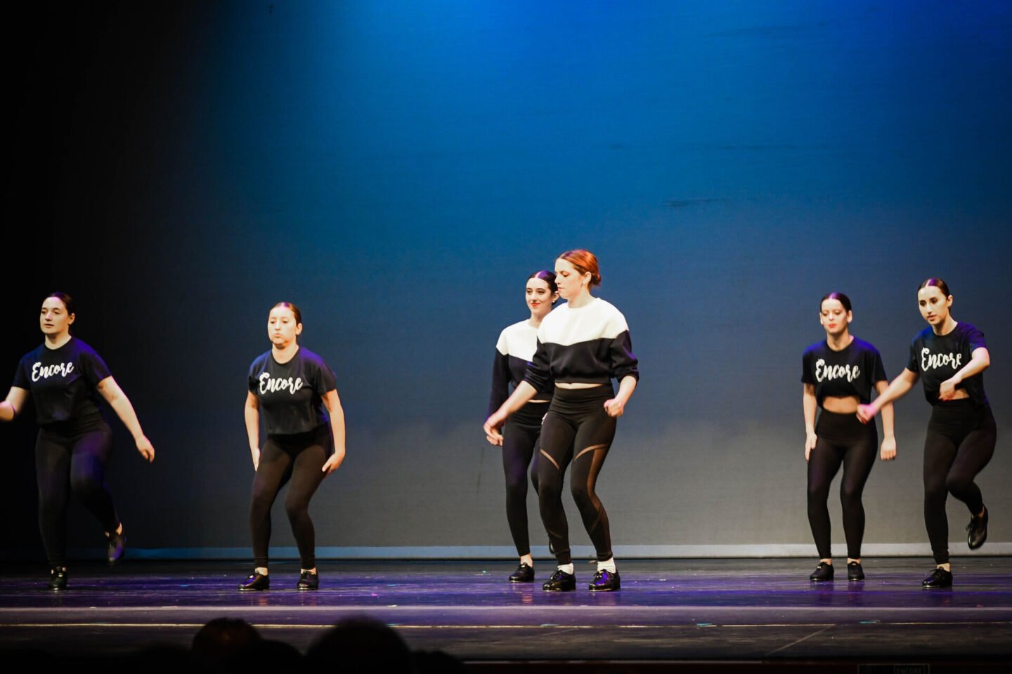 The first dance was tap and there was no music, just the rhythm of the tap shoes and some voices. They did a cute thing where they pretended Gabbie made a mistake and they all said “wrong dance, Gabbie!” and the audience laughed. Gabbie and the other senior are in the middle here, with the different costumes.