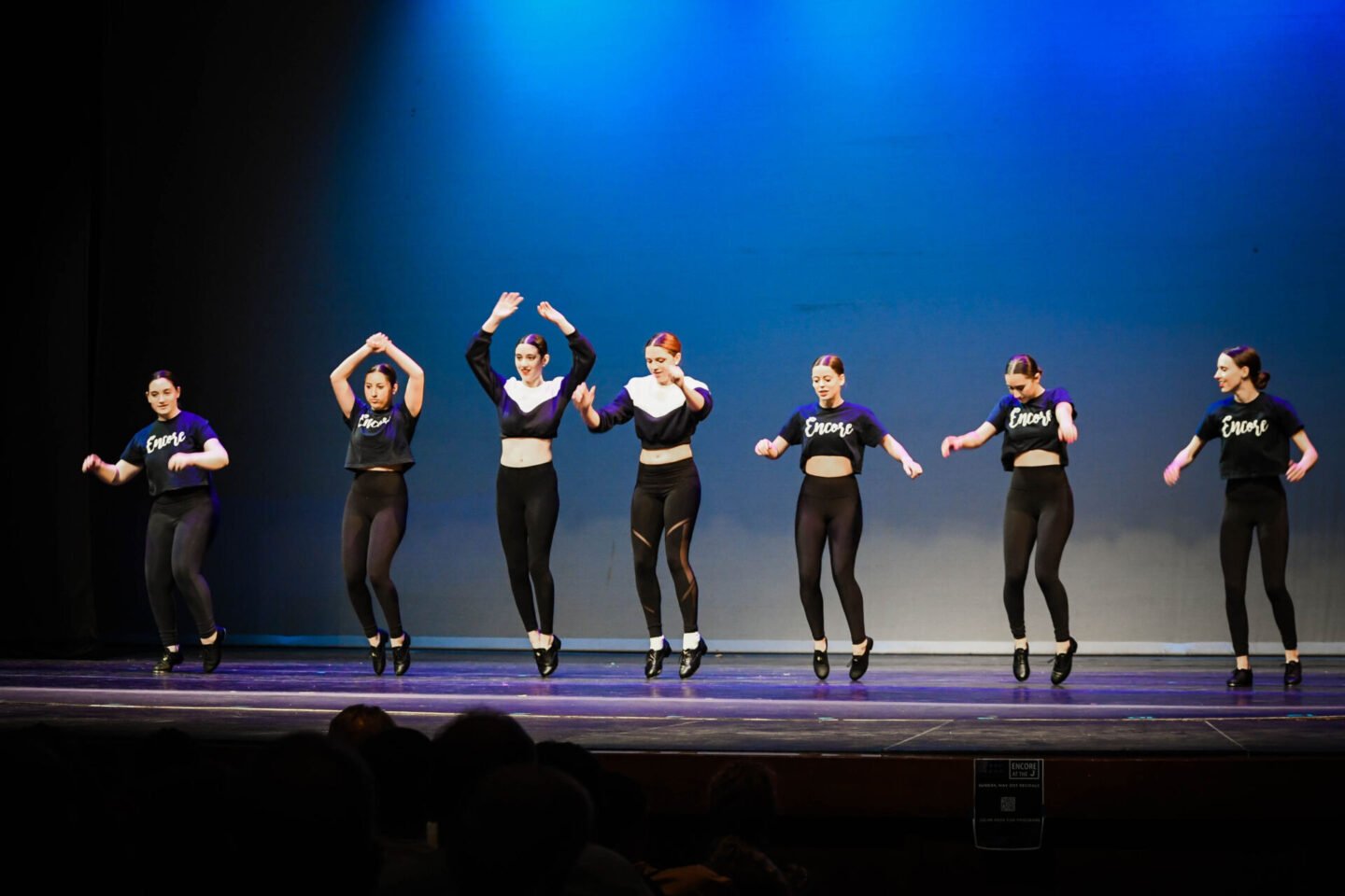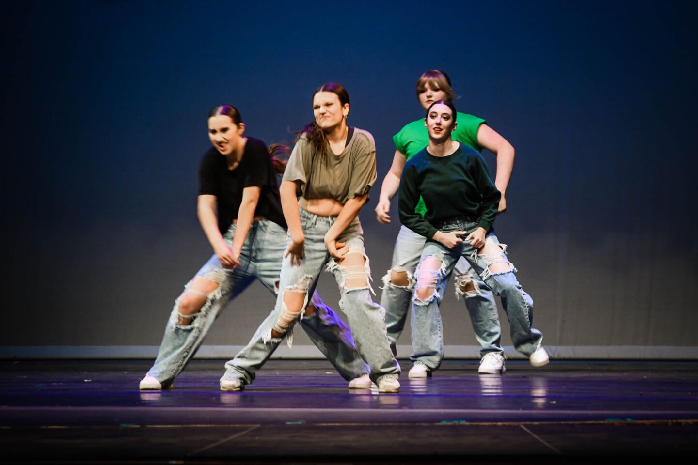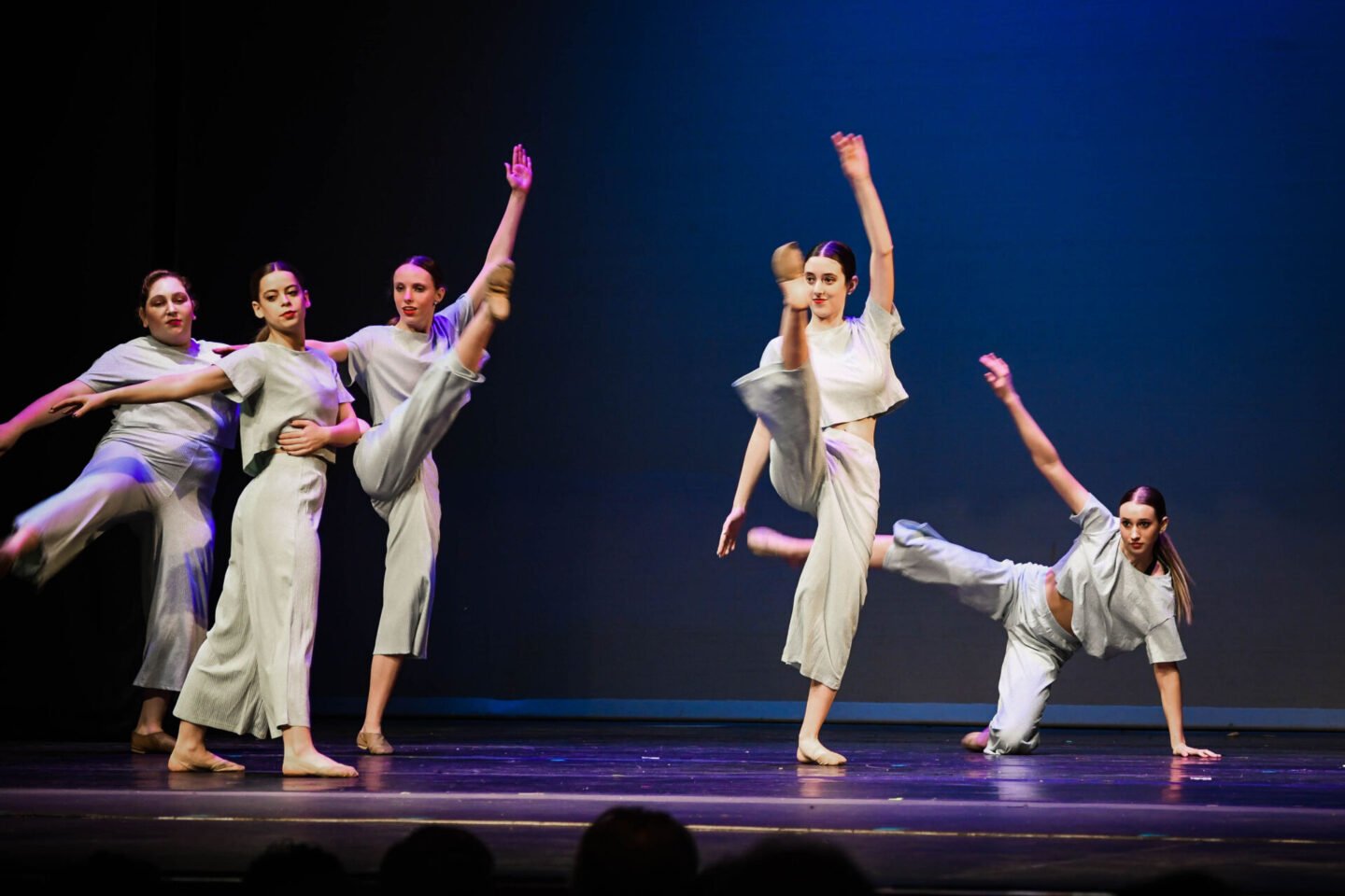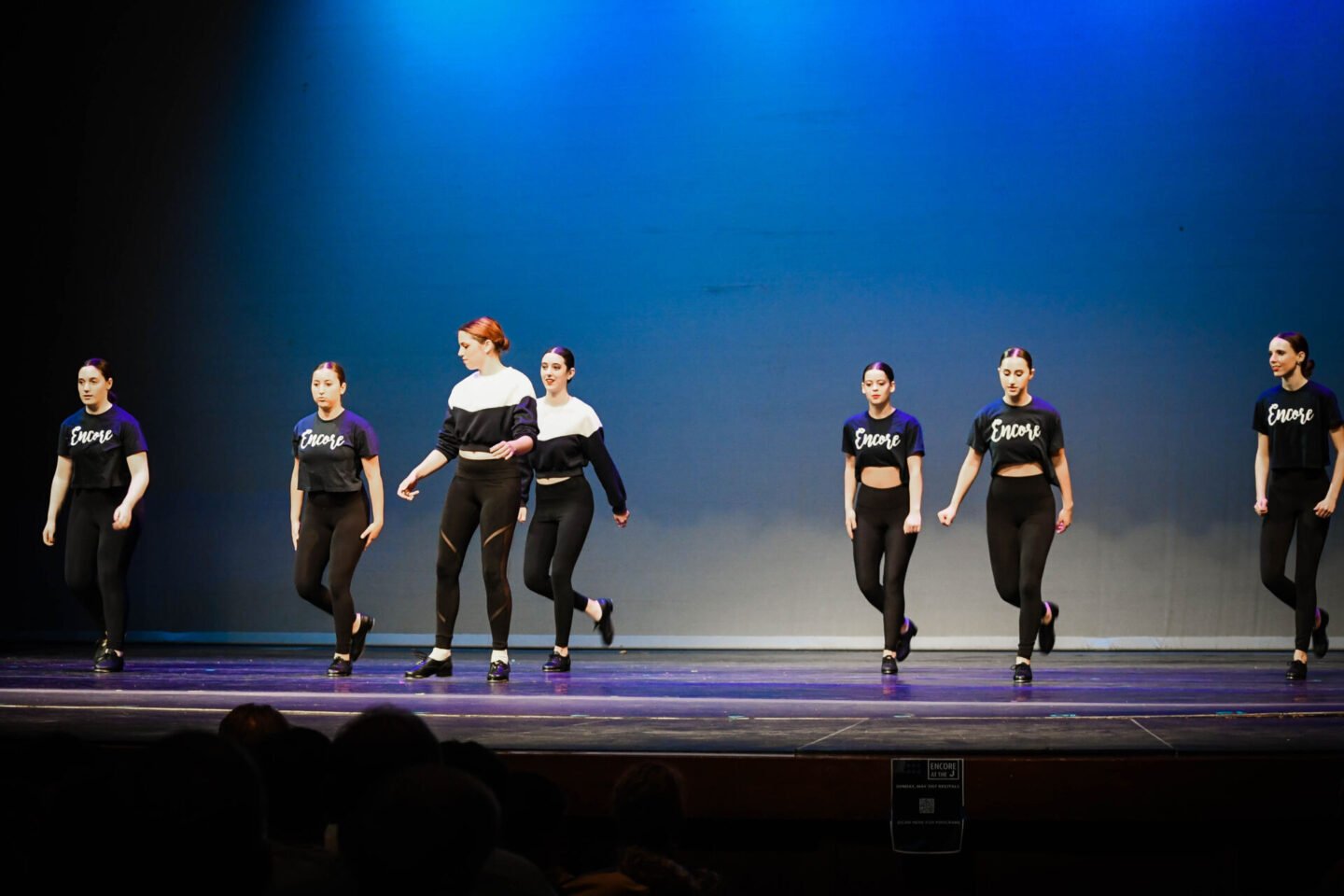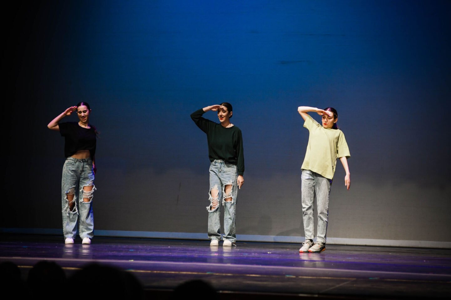 The first dance was tap and there was no music, just the rhythm of the tap shoes and some voices. They did a cute thing where they pretended Gabbie made a mistake and they all said “wrong dance, Gabbie!” and the audience laughed. Gabbie and the other senior are in the middle here, with the different costumes.
