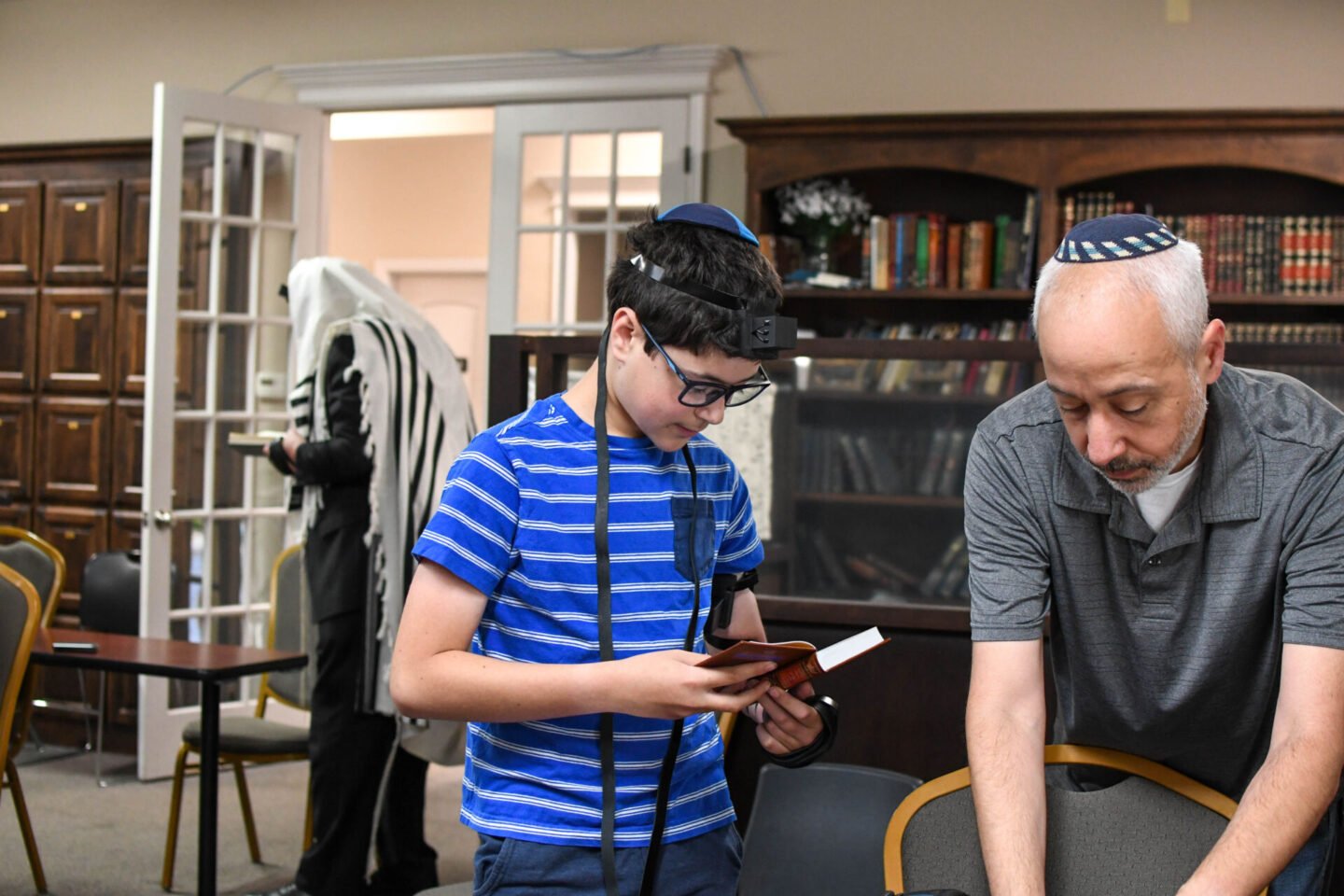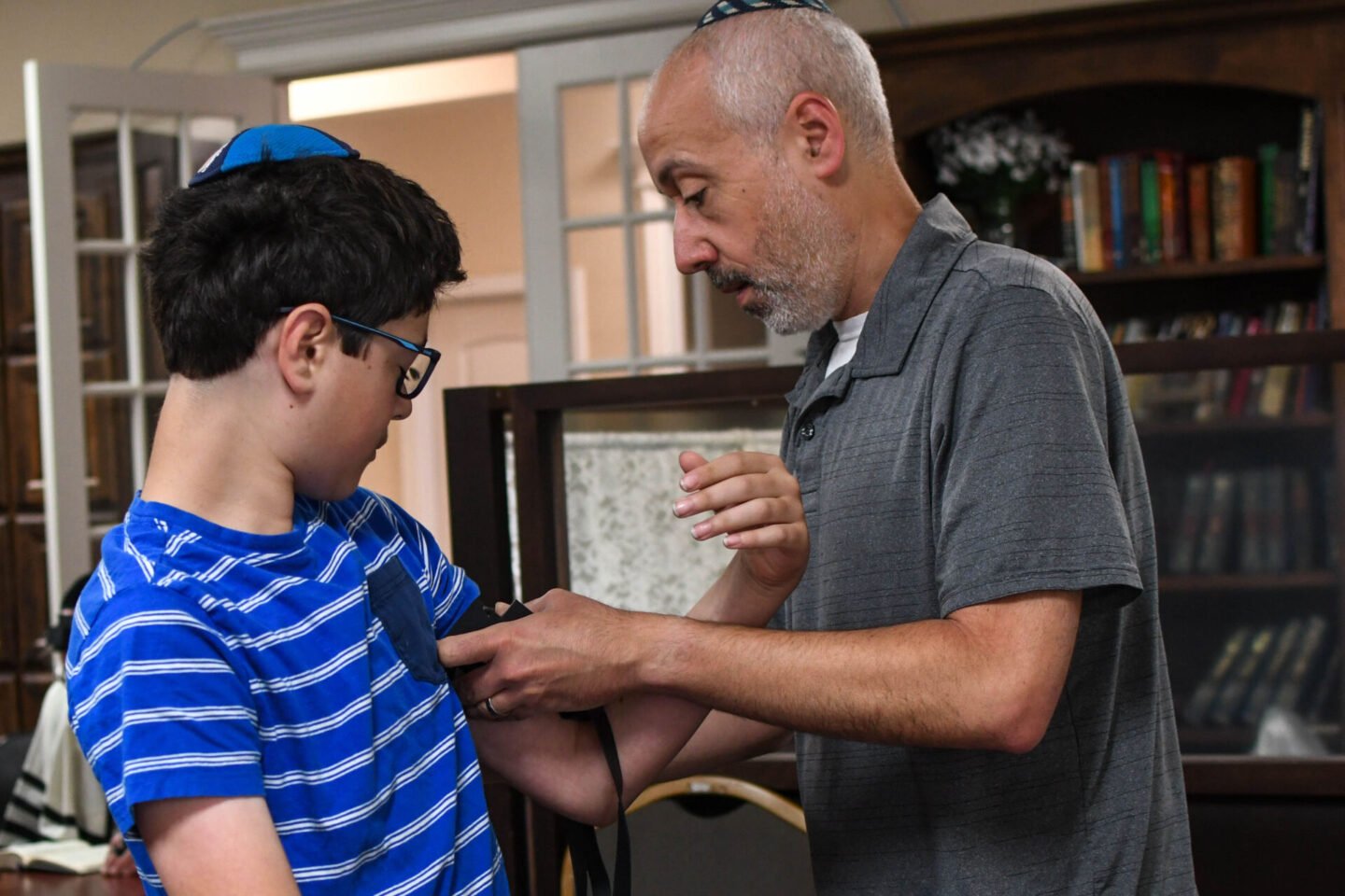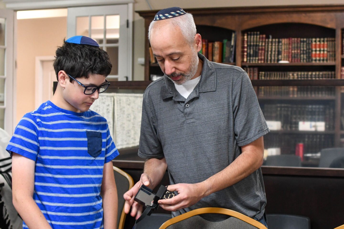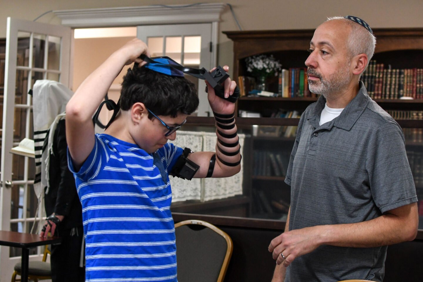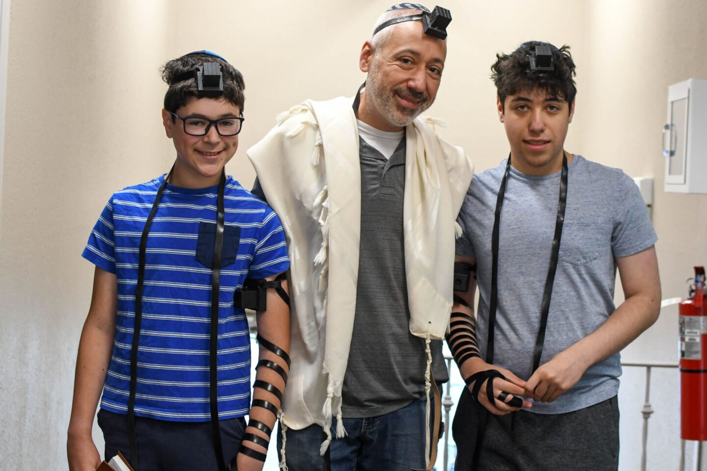 This week we celebrated Simon putting on tefillin for the first time. If you’ve been here awhile, you may remember when Zachary first put on tefillin – he looks so little! Tefillin is a set of small black leather boxes containing scrolls of parchment inscribed with verses from the Torah. Tefillin is worn by observant adult Jewish males during weekday morning prayers.