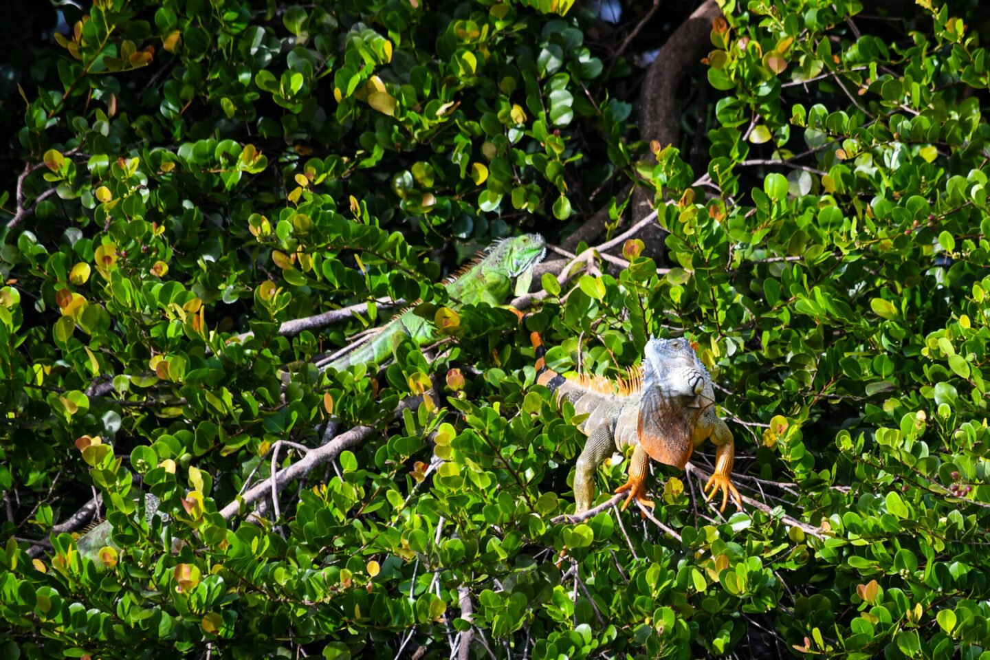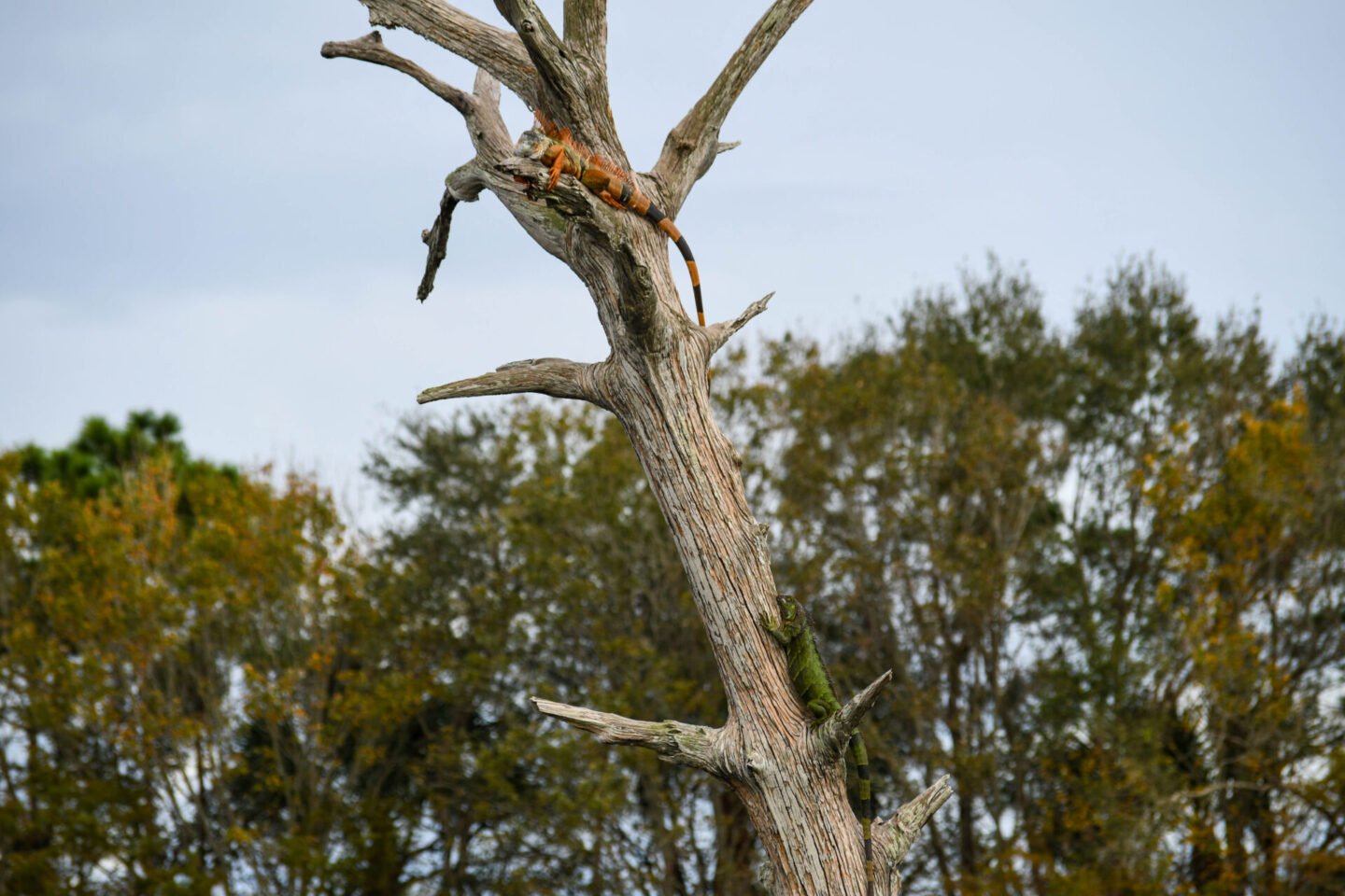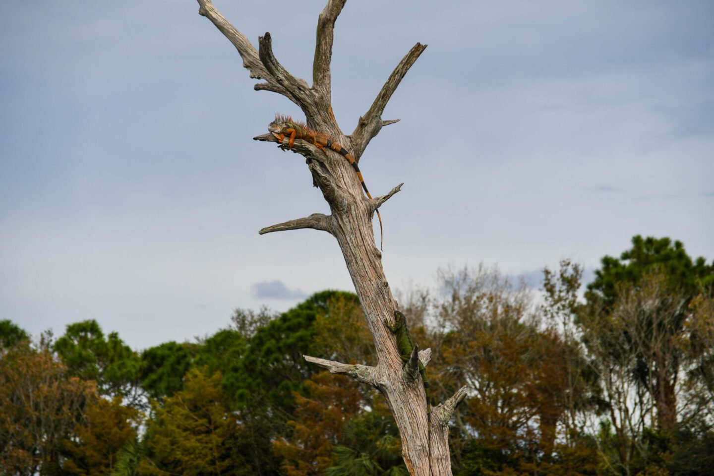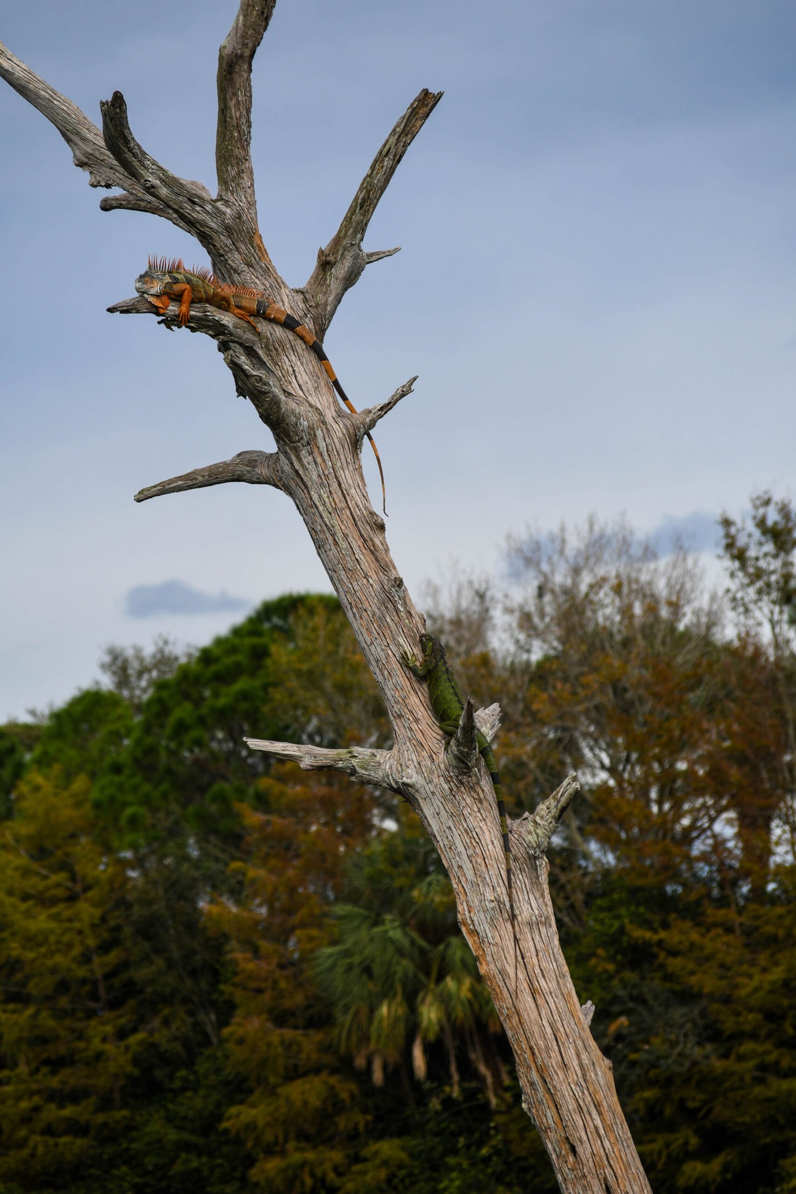 Not sure you can tell, but there are two iguanas on this tree. The orange and black one at the top, and a green one lower down.
