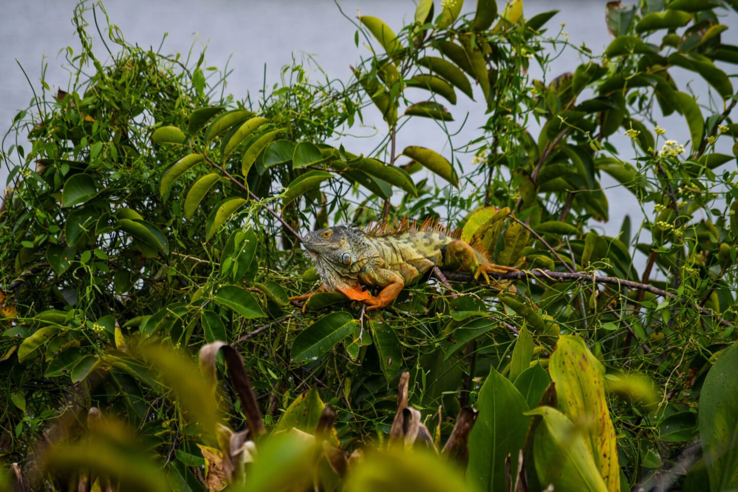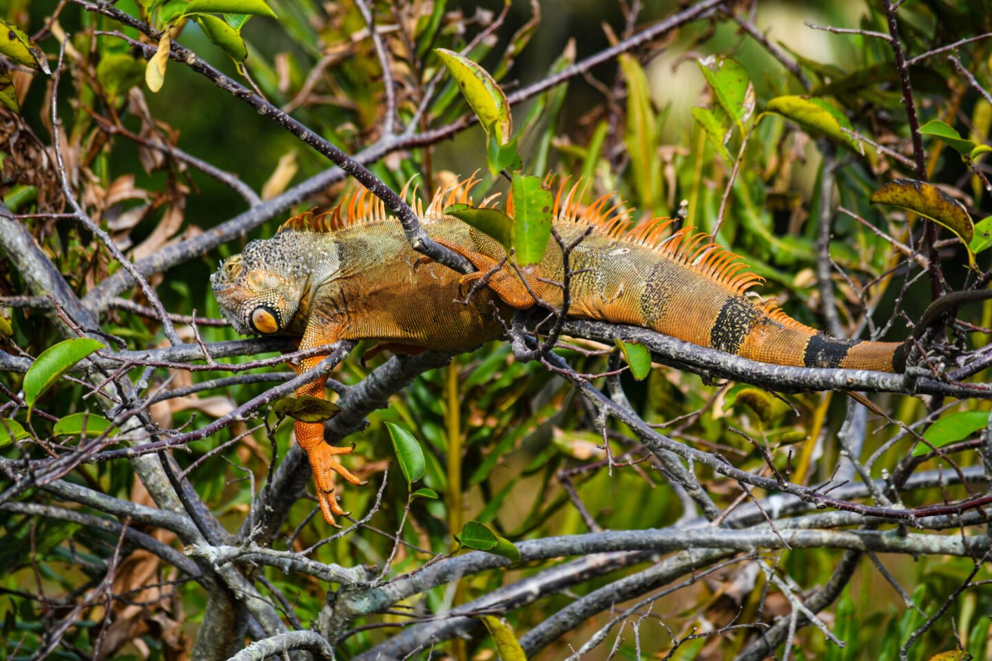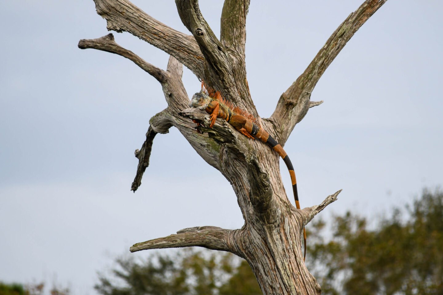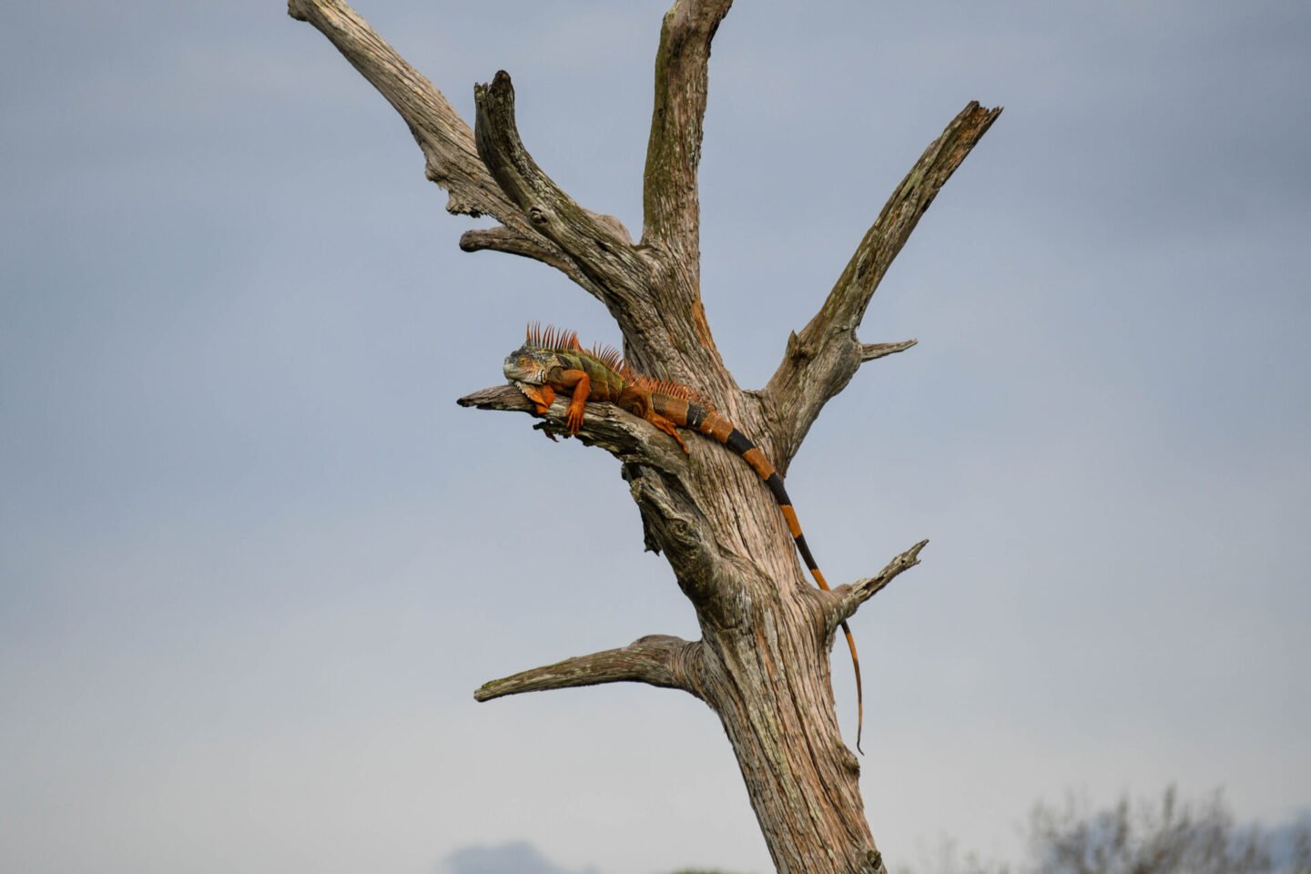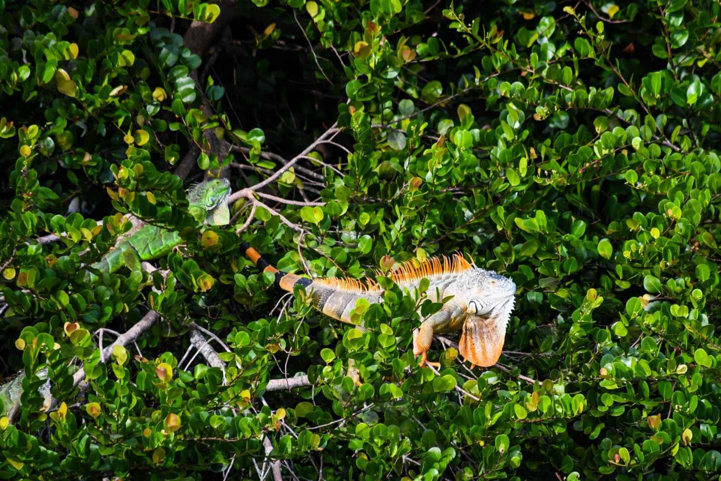 Not sure you can tell, but there are two iguanas on this tree. The orange and black one at the top, and a green one lower down.
