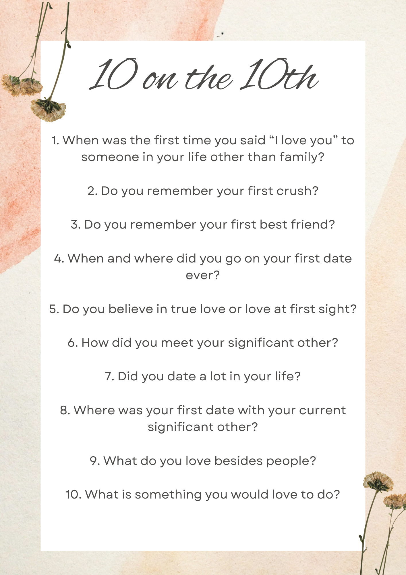 Today I’m answering 10 Questions About Love in honor of the 10 on the 10th link up. These are not the questions that Marsha chose for the link up this month, but you can still visit her blog if you’d like! Even though I don’t celebrate Valentine’s Day, love is still a good theme for February in my opinion! By the way, I also had a 10 Questions About Love post in 2021!