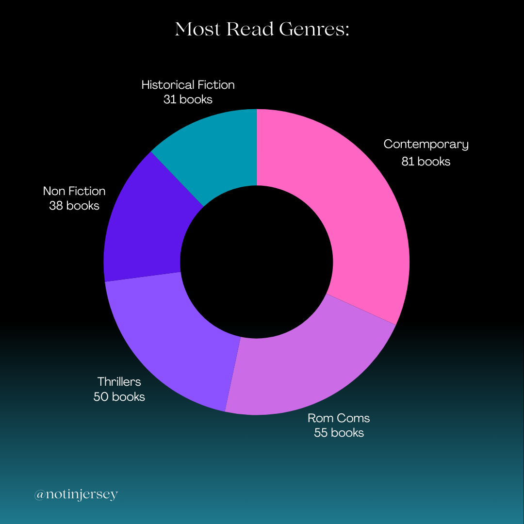 My next most read genres were rom coms, thrillers, non-fiction, and historical fiction.