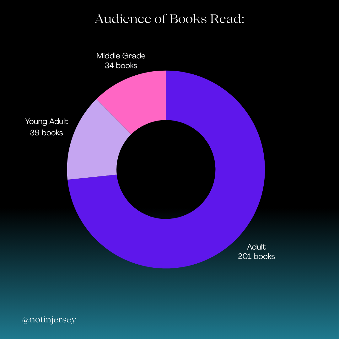 Approximately 73% of my books were adult books while 12% was middle grade and 14% was YA.