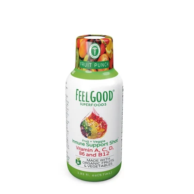 FeelGood SuperFoods – Immune Support Shot – Support your immune system with 26 organic superfood ingredients packed into a single shot with a delicious fruit punch flavor. Immune support shots* are vitamin-enhanced supplements that are full of plant-based nutrition from real fruits and vegetables.