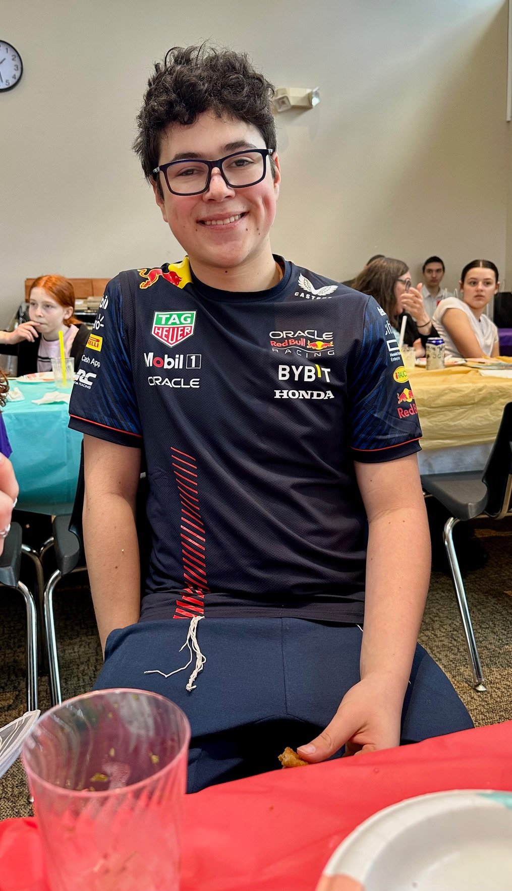 Simon dressed up as an F1 driver who is a person I’ve never heard of…but team Red Bull? I don’t know.